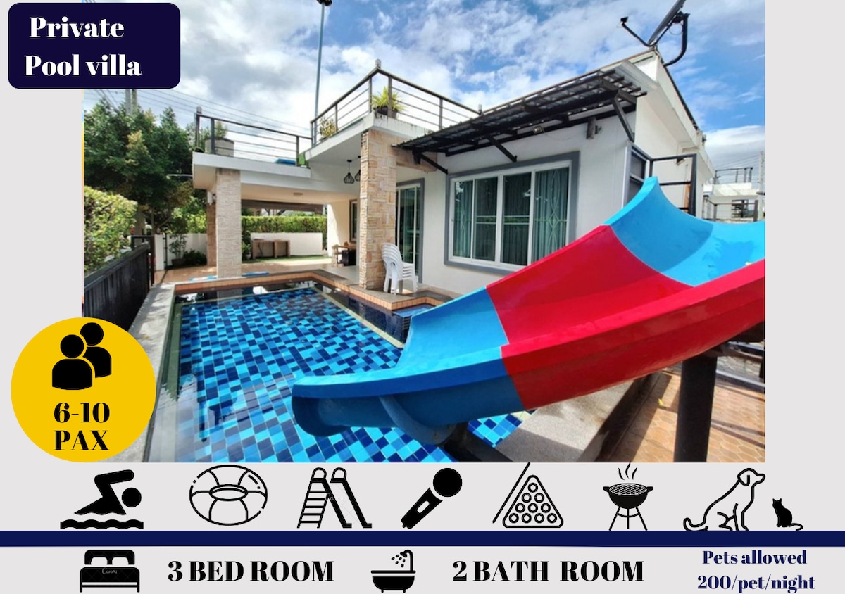 บ้านพักใกล้ตัวเมืองหัวหิน พร้อมสิ่งอำนวยความสะดวกครบครัน เหมาะสำหรับทำกิจกรรมร่วมกัน ในครอบครัวและเพื่อนๆ ***รายละเอียดบ้านพัก - ใกล้ทะเล ไม่เกิน 10 นาที - ใกล้ร้านอาหาร คาเฟ่ โรงเบียร์ ตลาด - สั่งเดลิเวอรี่บริการ และอาหารได้ถึงหน้าบ้าน - สระว่ายน้ำ - ห่วงยาง - สไลเดอร์ขนาดใหญ่ - โต๊ะพูลขนาด 7 ฟุต - คาราโอเกะ - Smart TV - Free Wifi - ผ้าเช็ดตัว - เครื่องทำน้ำอุ่น - เครื่องปรับอากาศ - เตาปิ้งย่าง BBQ เตาแก๊ส และเตาไฟฟ้า - โต๊ะม้านั่งยาว - เครื่องซักผ้า - ไดร์เป่าผม - วิวภูเขา