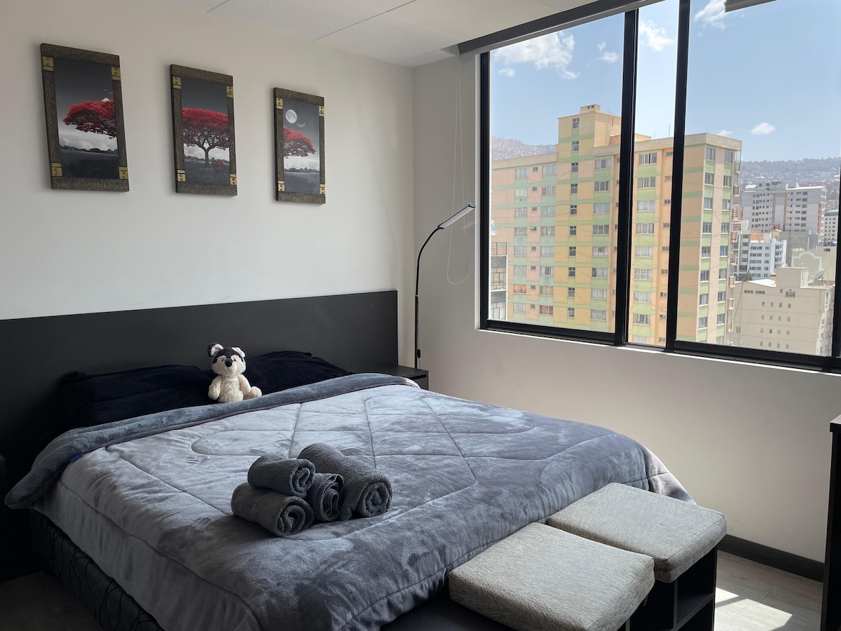 New, spacious, high-floor, and very bright apartment. Ideal for rest or work trips. It has a bedroom with a walk-in closet, two full bathrooms, an equipped kitchen, and a large living/dining room with beautiful views. Located in a safe area, close to cafes, restaurants and supermarkets, with excellent public transport connections. If you prefer to walk, it's perfect for getting around easily. Enjoy La Paz with comfort, style and warmth. Your cozy space awaits!
