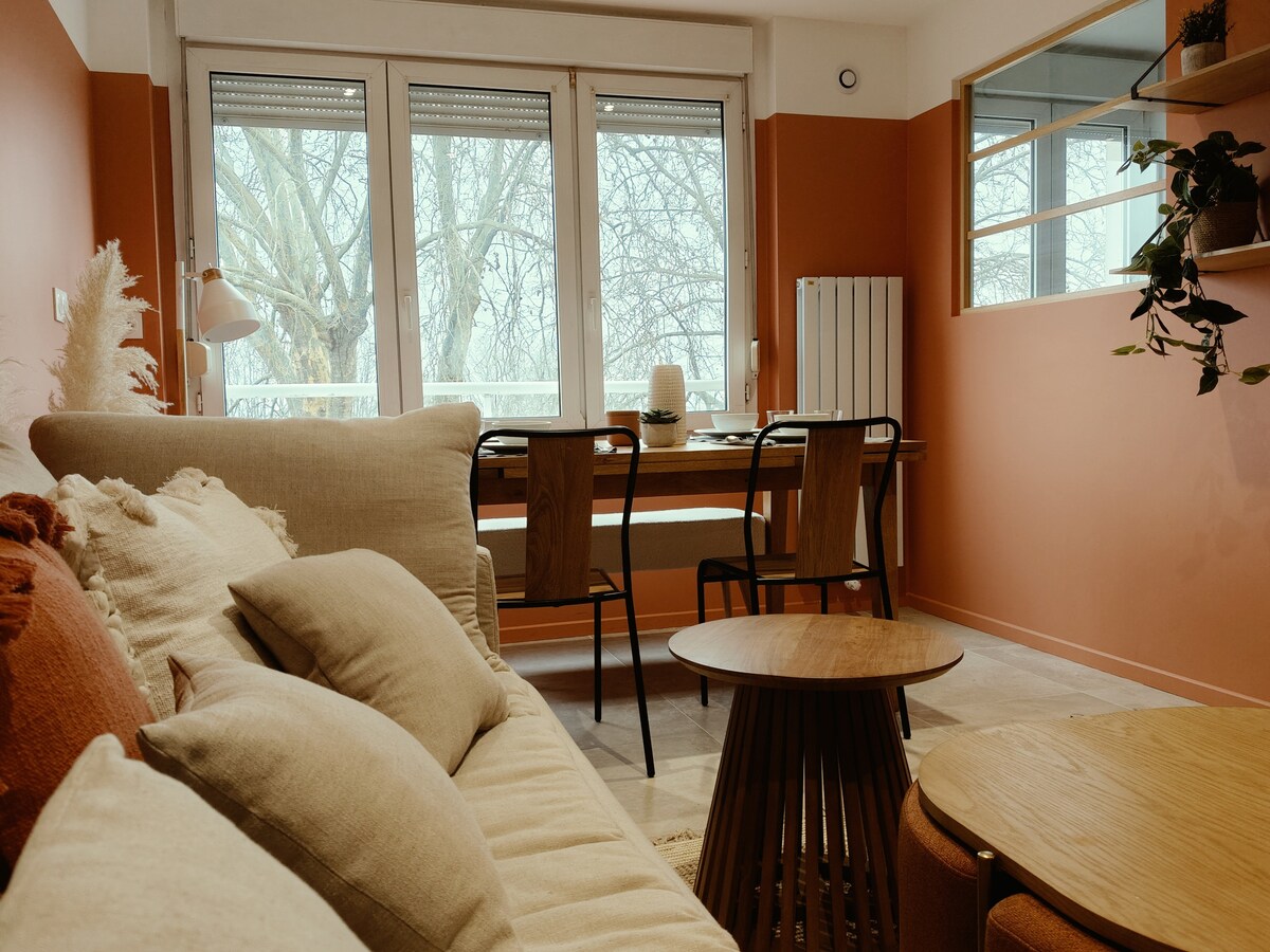 Ce logement affiche un style résolument unique. Un Appart de haut standing pour des moments de détente et d’intimité dans un contexte luxueux. Un salon ouvert sur cuisine équipé avec vidéo projecteur géant et un home cinéma pour être en total immersion lors d’une soirée Chill. Chambre spacieuse avec un lit QueenSize (160x200) confort assuré. Une salle de bain luxueuse avec douche a l’italienne comprenant un jaccuzi 3 personnes et un sauna pour 3/4 personnes avec accès direct à la chambre.