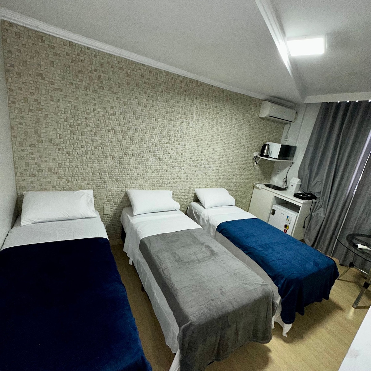 Lugar central, prédio pequeno e tranquilo. Com 1 suíte climatizada, tem 2 camas solteiro ou juntas formando uma queen. O padrão da cama é casal, caso o hóspede deseje 2 de solteiro deverá solicitar antes do check in. Tem cozinha completa, vaga de estacionamento coberta. Wi-Fi, tv 43" e máquina de lavar roupa. Fica no segundo no segundo andar do prédio , acesso com um lance de escada.