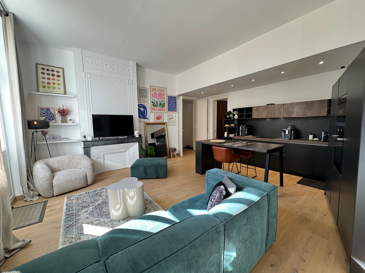 A 95 m2 duplex apartment, privileged location, in prestigious street directly overlooking the 'Jardin Public' is a cosy and chic home base. The flat on third floor, elevator, building 18th century. Downstairs living room and kitchen. Upstairs two bedrooms. Bathrooms with showers and toilet on each floor. The decoration is matching traditional Bordeaux stone walls with modern contemporary style.