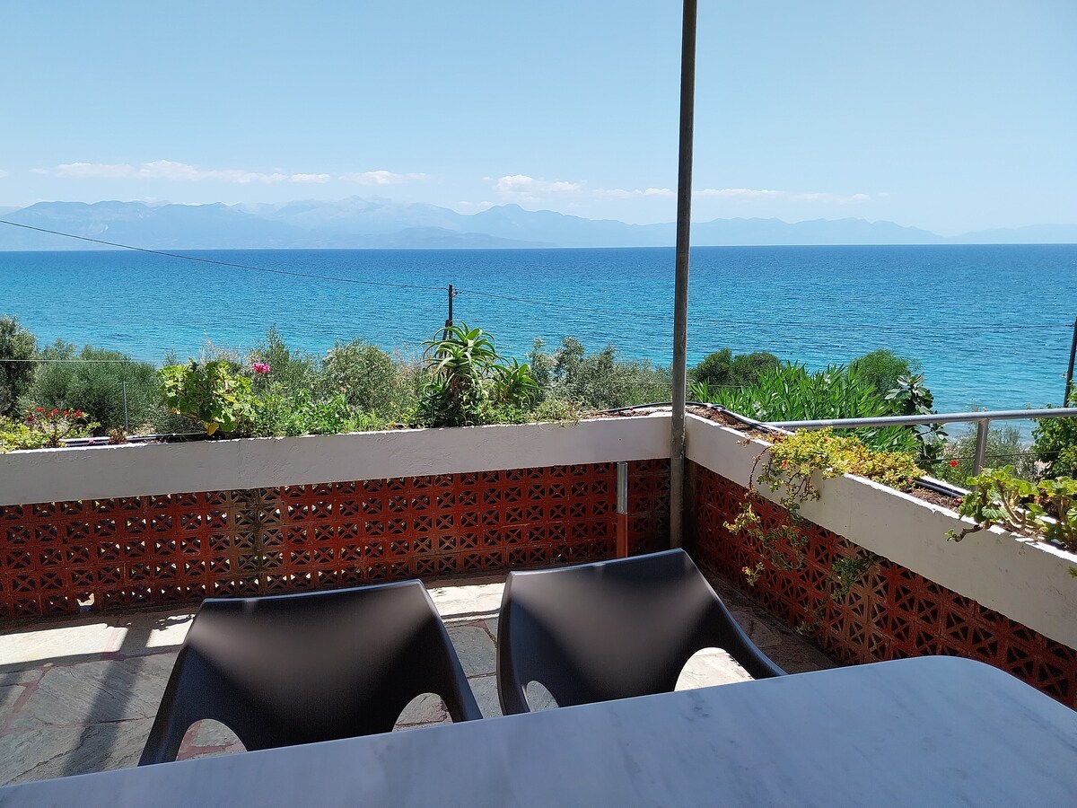This house is a tribute to our dearest mother Ioanna who was born in this village and her wish was a house by the sea she so adored. It's our family getaway, our childhood paradise of joy,swimming and daydreaming. We are happy to host guests and families who love nature, sea and peace. Enjoy its special vibe and location, amazing sea view, peaceful surrounding with no direct neighboors. Nested in a private 2hectares olive grove, 20metres from a peaceful beach, 5' walk from the market&taverns.