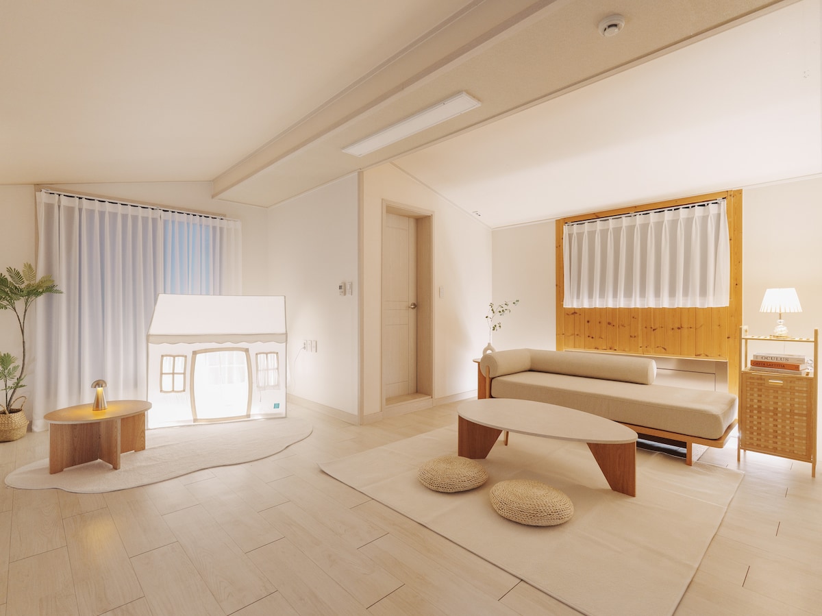 복층 구조의 온 가족이 머물기에 적합한 넓은 숙소입니다. 천안아산역에서 1km거리 무료주차가능 [게스트 전용 공간] * 거실, 침실 2개와 화장실 1개 침실1 ) 더블베드 1개 침실2 ) 더블베드 1개 * 복층 : 거실, 침실1개와 화장실 1개 침실1) 더블베드 2개 [편의시설 및 서비스] * 도보 50m 편의점(CU아산장재점) * 건물 1층 고향회관 (아산 맛집 / 가족모임 또는 손님 추천메뉴로 강추) 주방 ) 6인 식기, 냄비, 후라이팬, 밥솥, 와인잔, 맥주잔, 소주잔 욕실 ) 샴푸, 컨디셔너, 바디워시, 핸드워시, 수건 Wi-fi 사용가능