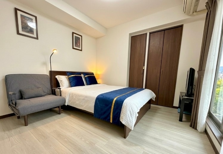 * Room size 70 sqm * Western-style room for 4 people with 2 standard double beds (147*200cm) Muji solid wood bed * Japanese-style room for 4 people with 2 standard double beds (147*200cm) Muji mattress * Open-plan Japanese-style room with two additional single futons (2000 yen for one additional futon) This room has a spacious kitchen and dining area, great for families to stay together * TOTO bathroom, comfortable bathtub, washlet, washbasin, perfect for a hot bath after a day of travel, and you can have the same comfort as at home!