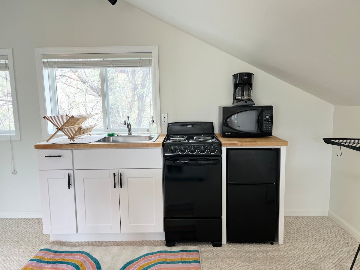 One bedroom apartment attached to what once was a historic log bar now an art gallery and frame shop. This business is closed for summer of 2025. The apartment is spacious, about 500 sq ft with sliding door opening to a large deck with table and chairs, propane BBQ, and views of mountains. Lounge chairs are available in the warmer months. It is an ideal location, so close to Chico Hot Springs, 4-5 restaurants and bars, fishing, hiking and the quaint western town of Livingston!