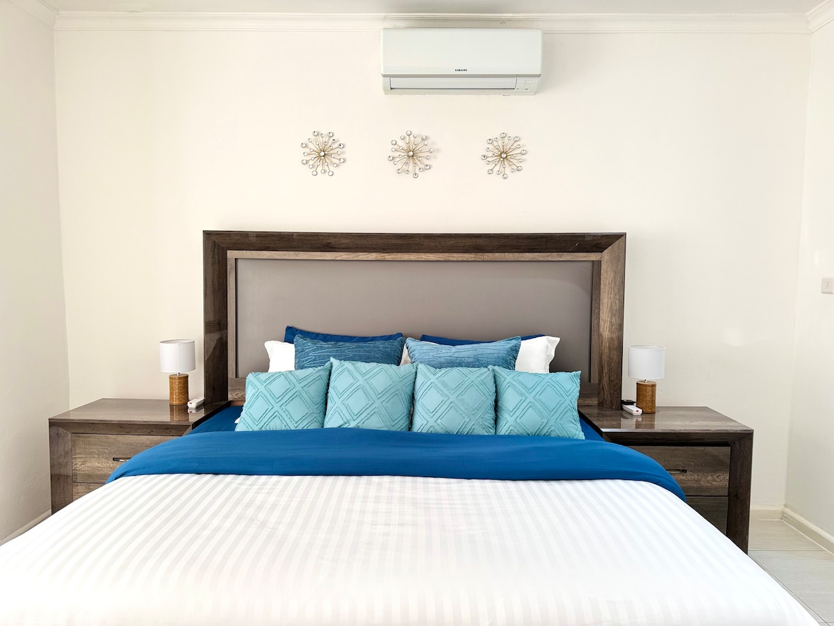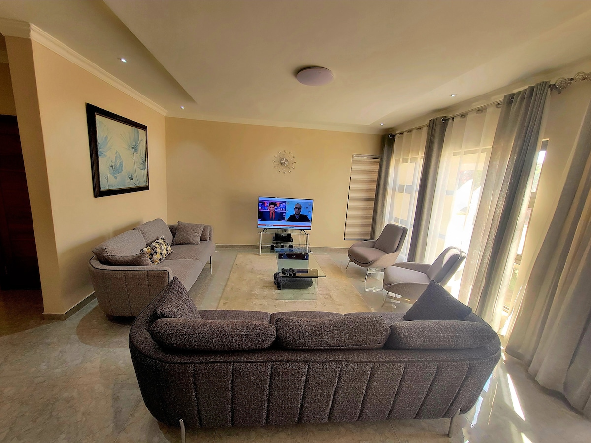 Modern, private, and perfectly located! Enjoy an LG Dual Inverter AC, LG OLED Evo AI 55" TV (2025 model) with prime video. Netflix, YouTube etc. Starlink WiFi. 2m orthopedic hybrid bed, 24/7 power, hot water, a solar iron, and a full kitchen with gas stove, double-door fridge, bar stools, and cocktail glasses. Relax in a cozy living room with a ceiling speaker, workspace, and beautiful couch. Just 5–10 minutes from six malls. You’ll love it here. Book now!