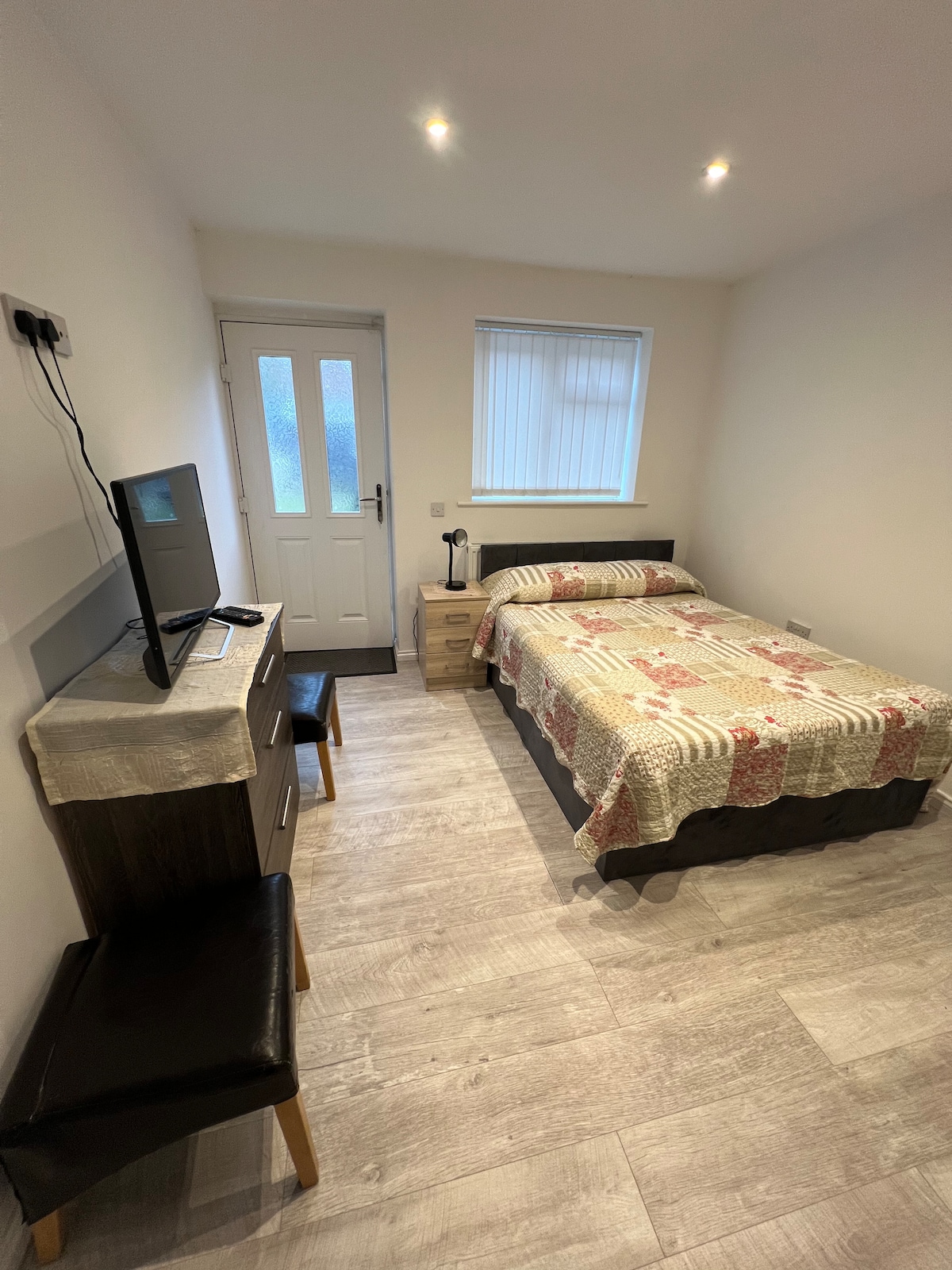 A new built (2021) studio for visitors (single or a couple) to the South Liverpool area with access to transport links local tourist attractions. New for '23, overnight EV charger available (payable locally). The studio comprises all you need for a short stay (business or leisure); king size bed, work space, wardrobe and en-suite. Wi-fi and self check-in is Included. Restaurants, bars, local stores, Hope University and Lime Pictures are within walking distance.