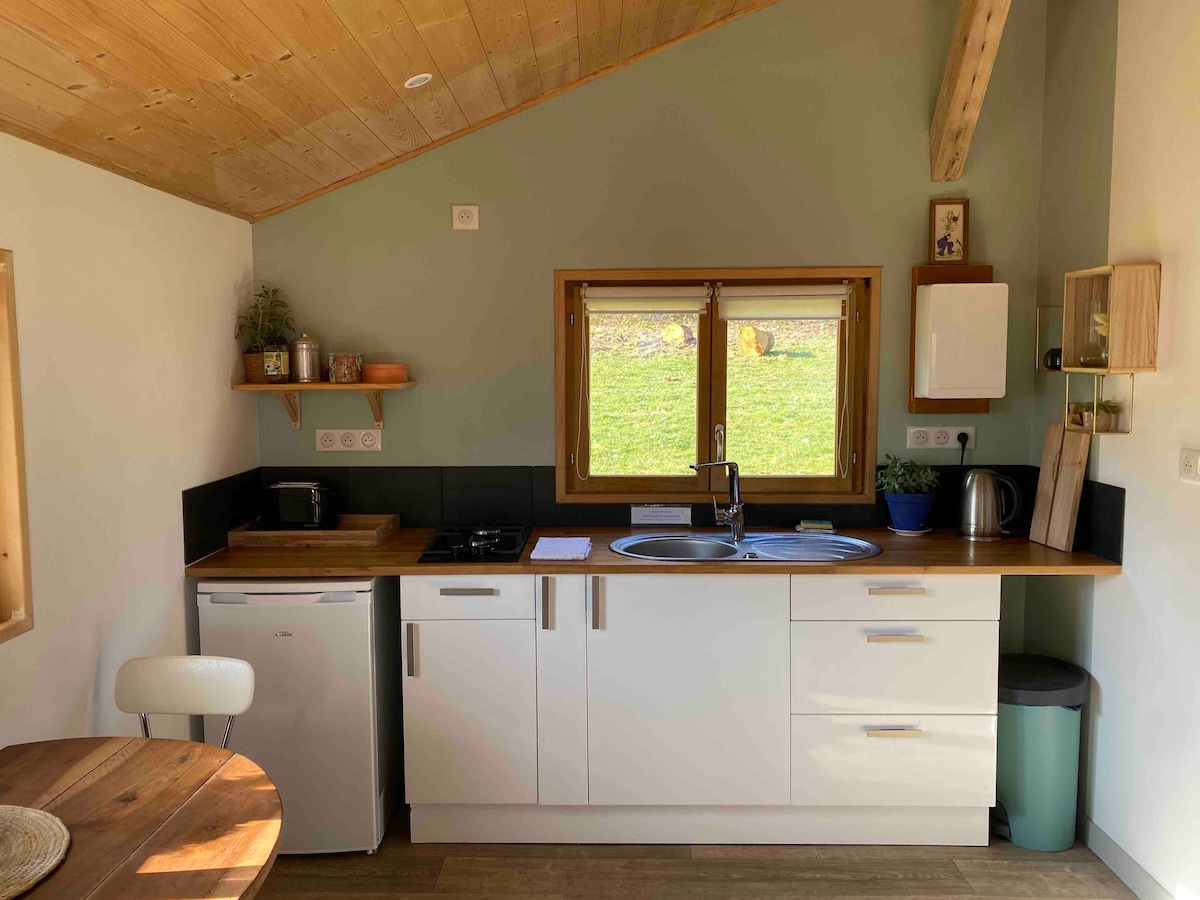 Ideal for relaxing, walking or sightseeing. Small isolated chalet, in the middle of nature in the heights of Beaujolais. It has a kitchenette, a sleeping area, a bathroom and a separate toilet in the same room. There is also a terrace with a small swimming pool (from June to September). This 20 m2 accommodation is for 2 people, but it is possible to pitch a tent next to it if necessary with a supplement. 25 minutes from the A6, Mâcon, 1 hour from Lyon. No Wi-Fi or TV on site.