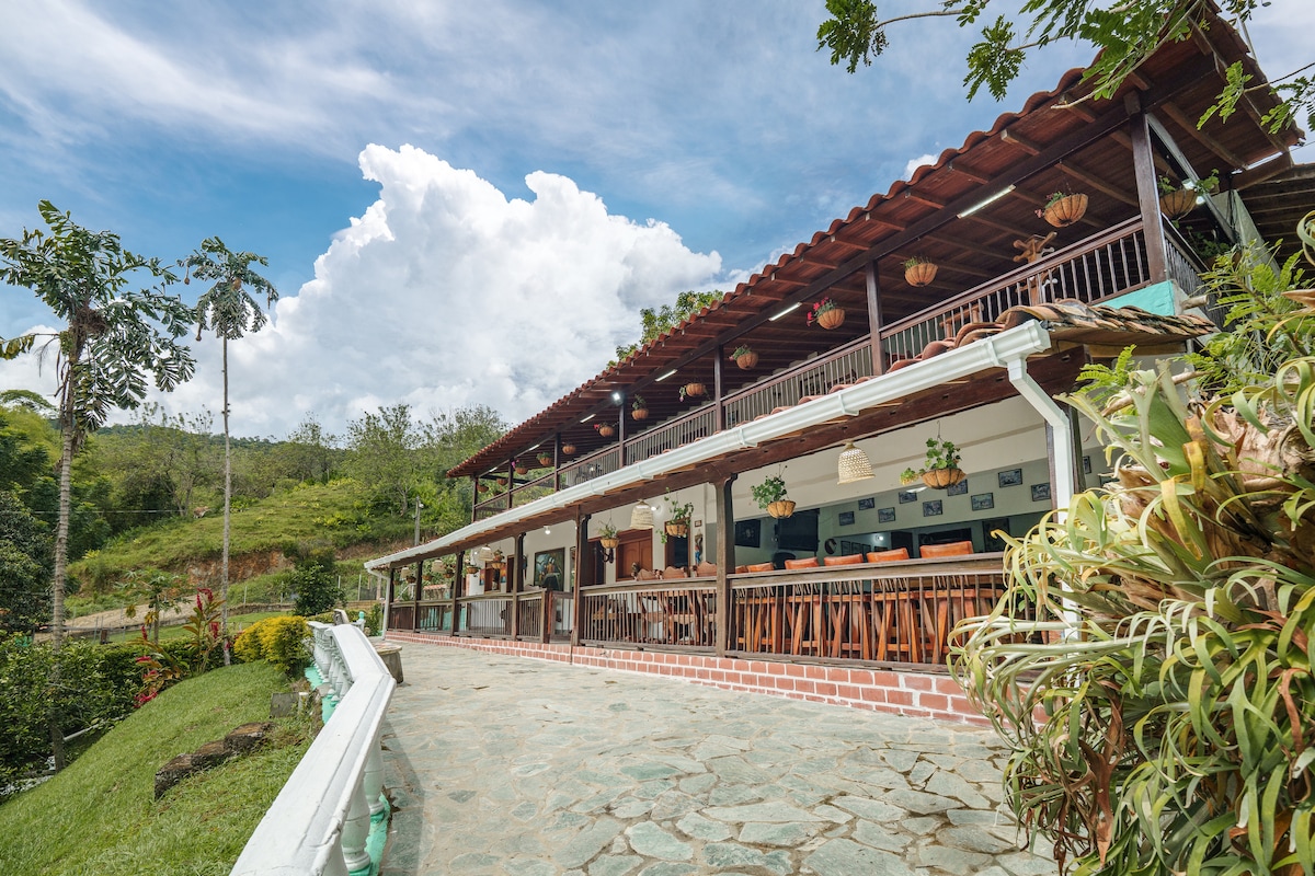 Enjoy the majestic view of the Farallones del Citará from this exclusive estate in southwestern Antioquia, designed for families looking for a private pool and complete privacy. Located in the heart of Ciudad Bolívar, our property combines the ideal warm climate with the coolness of the mountains. Here, you can truly disconnect, and the scenery takes center stage during your vacation. Welcome to your home in the Coffee Region!