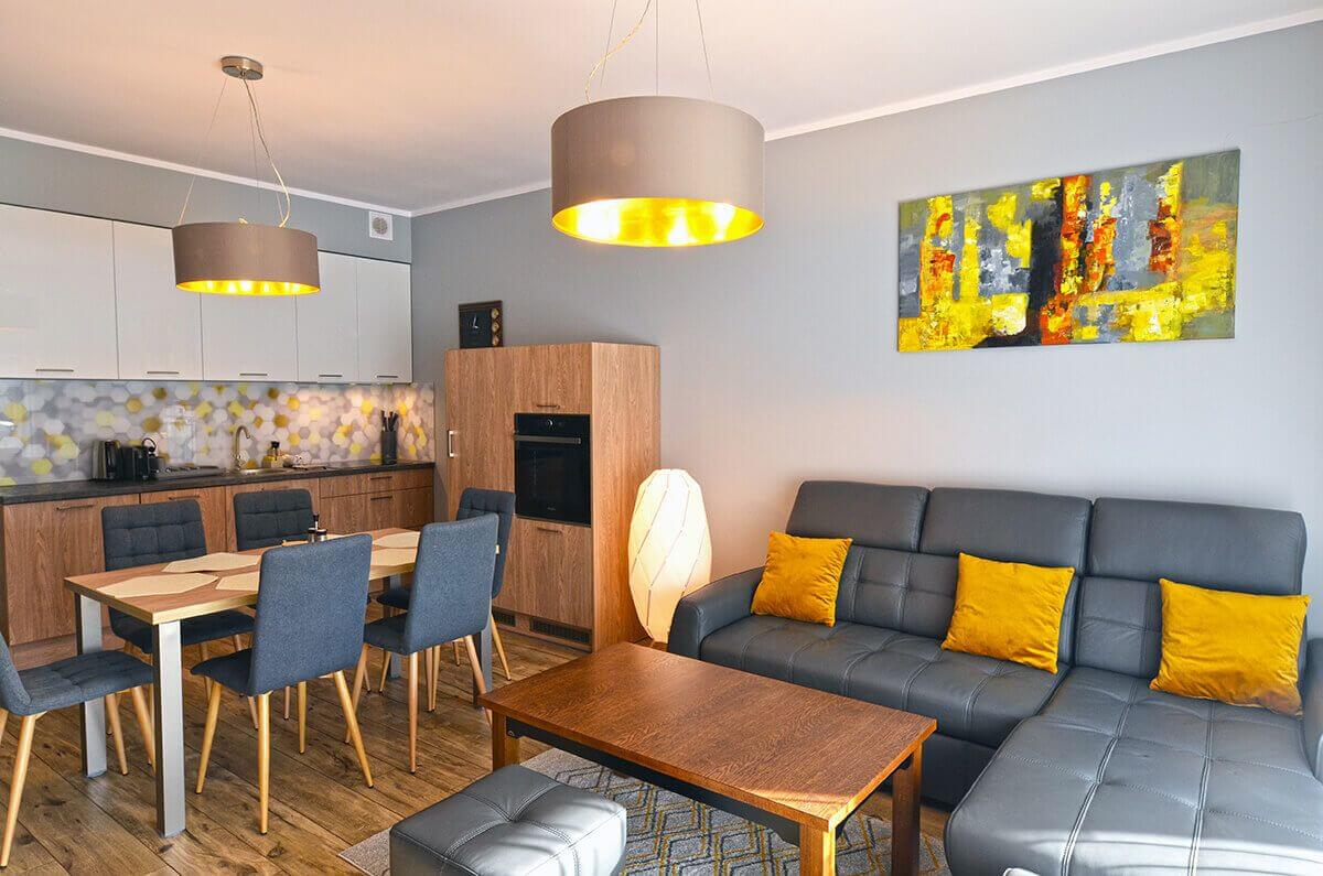 An apartment in a complex right next to the forest, among the fields and the silence of mountain nature. It is an ideal space for people looking for rest away from the hustle and bustle, and at the same time valuing comfort, style and functionality. The apartment is decorated in a colorful way, but with a great sense of taste – warm colors and cozy interiors make you feel right at home. The apartment also has an exercise ladder, perfect for a morning start or evening stretching after mountain hikes.