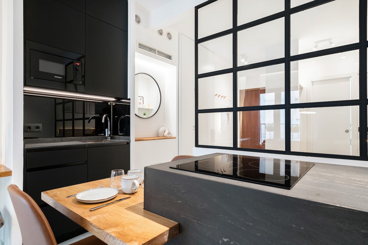 Magnificent 45 square meter apartment in the heart of Madrid. With spectacular design and decoration, spacious areas, and high ceilings, the apartment is equipped with everything you need for your stay in Madrid. The living room has three balconies overlooking the street that provide great brightness to the flat. The bedroom has an en-suite bathroom and a work desk. From the apartment, you can walk to almost all the iconic points of Madrid.