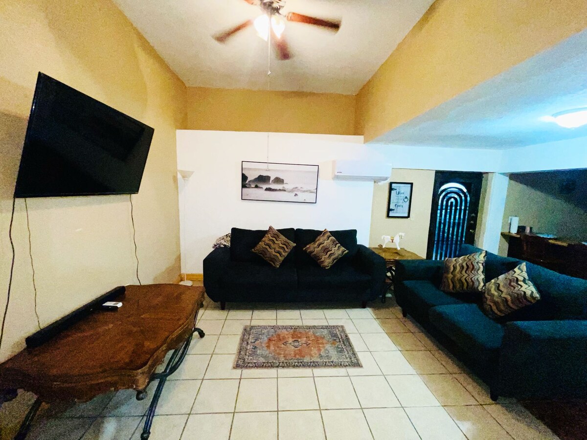 "House located near the city center, in a very quiet area, 2 minutes from Calle Hidalgo and 5 minutes to the international bridge, the accommodation has 2 beds, 2 double in separate rooms, and a sofa in living area, refrigerator, kitchen, kitchenette, dining room, microwave, hot water, private parking with automatic door inside the property and a small patio that will be available to the guest. Living room and bedrooms with its air conditioning