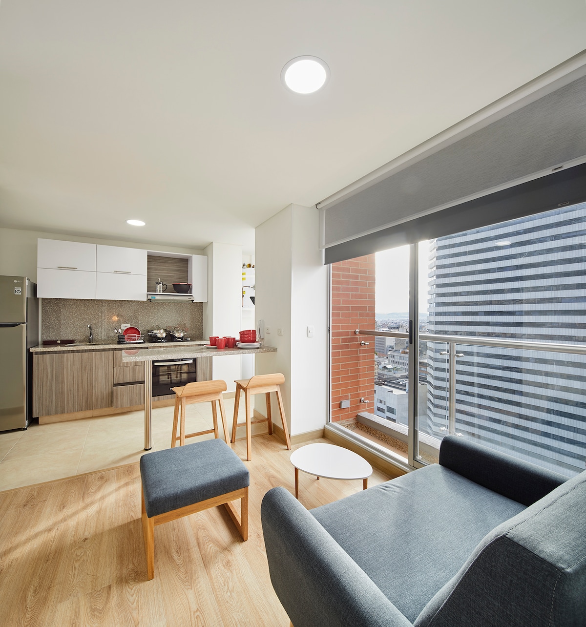 Beautiful loft apartment located in the International Center of Bogotá, one of the city's major urban, cultural, gastronomic, architectural and business areas, very close to the Historic Center and the La Macarena neighborhood. With spectacular views of the iconic Bogotá hills, in a new building with pool, sauna, jacuzzi, gym, viewpoint with BBQ, meeting room, only half a block from Carrera 7.