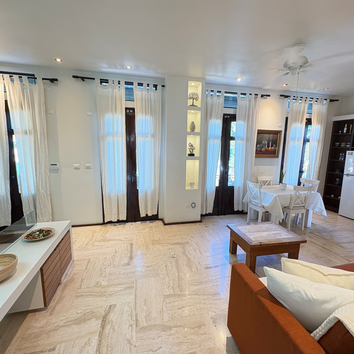 Walk around the bustle of the oldest city of the Americas filled with museums, galleries, restaurants and bars. Then escape street noise by staying at the Paseo Colonial - a hidden green treasure perfect to relax. Apartment 12 is a bright 1 bedroom apartment fully equipped to ensure you enjoy your stay. It boasts a kitchen with items to enjoy your cooking, a living room area, and a separate large (king bed )room with shower. We offer cleaning. We look forward to welcoming you!
