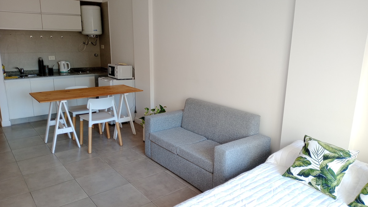Forget your worries in this spacious and serene space. Bright and modern studio for 1-2 people. Located in Villa Crespo, very close to Palermo and Chacarita, a very quiet and residential area with bars, restaurants, an outlet area, supermarkets, and parks. With multiple means of transportation for the whole city (subway line B, Metrobus and bike lanes). Close to milongas, tango academies, and the Movistar Arena