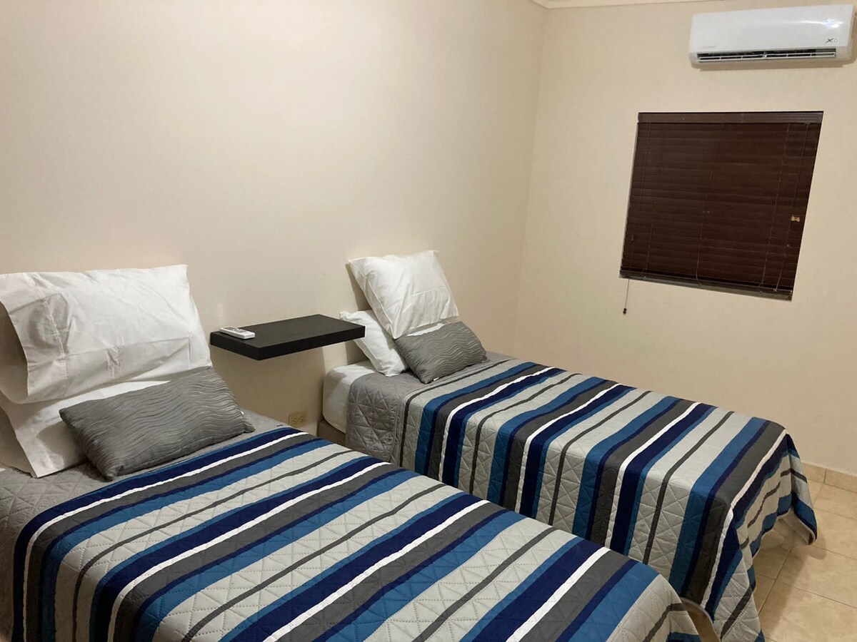 This place is strategically located: it will be very easy to plan your visit! Close to IMSS, PLAZA GOYA, TUTULI, LAGUNA, ITSON. Apart from having all the services from Wi-Fi Internet, TV, electric fireplace, electric shower, washing machine, rest area or work room, as well as cable service and VIX for entertainment. It has two air-conditioned bedrooms and a bed for 2 independent people, a full kitchen (refrigerator, grill, microwave.