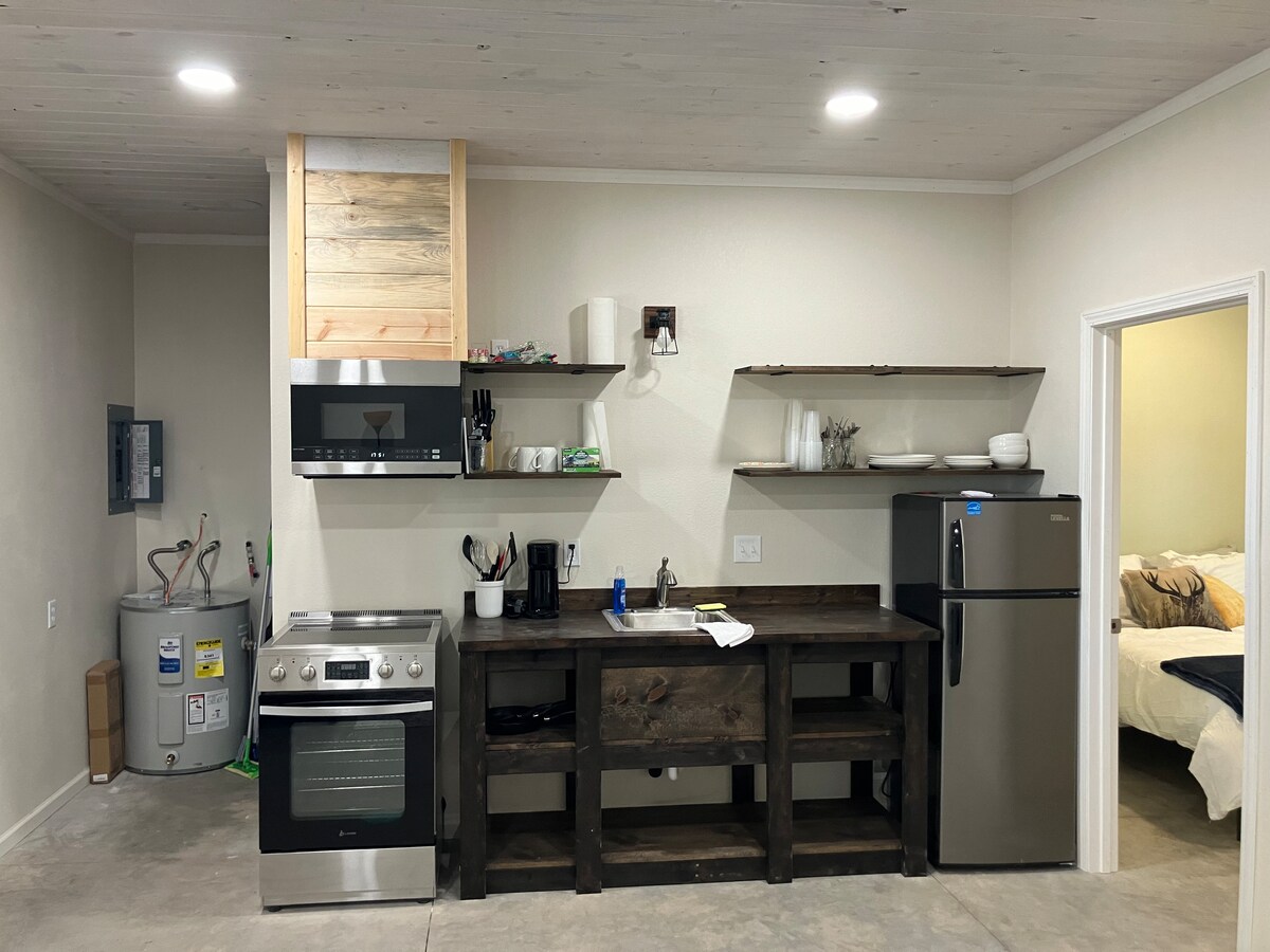 Comfortable accommodations with blackout curtains for a restful sleep, a kitchenette equipped with a microwave and mini-fridge for quick meals, and fast Wi-Fi to keep you connected. Your crew will have a king bed AND a queen bed to stretch out on. All linens (including the comforters!) get washed between every guest. This is a pet-free and smoke-free property. These rules are strictly enforced. My private residence is the back of the house. There is no shared space.