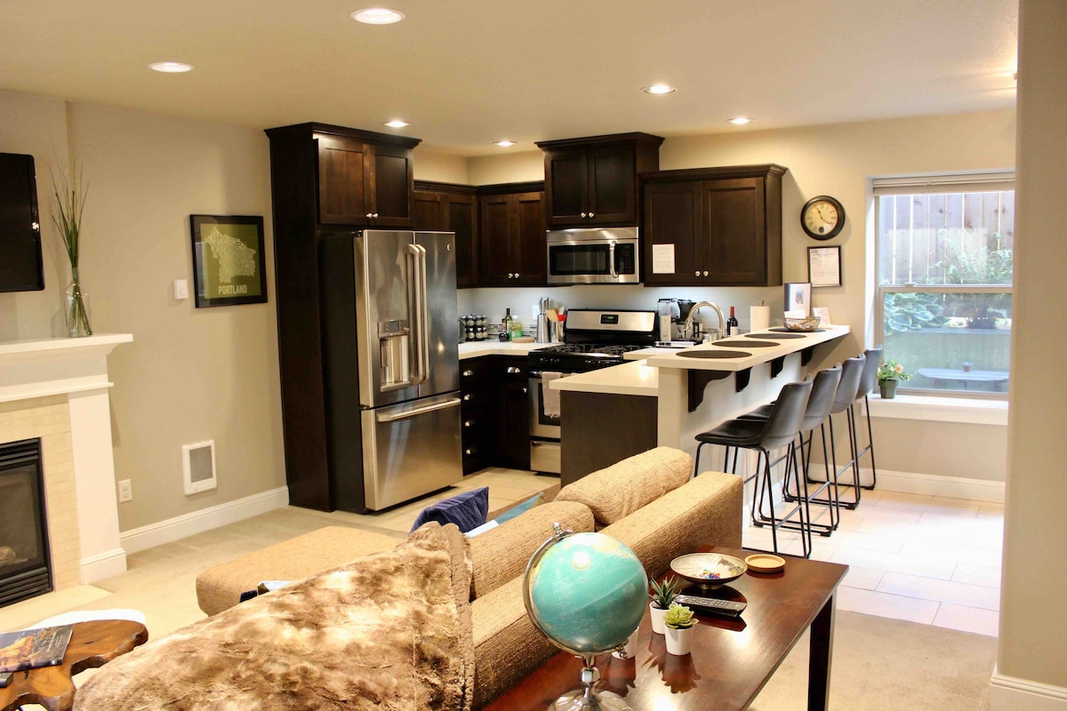 Fireplace Flat: top 5% of Airbnb listings for guest satisfaction! Walk to U of Portland! Private 725 sq. ft. 1 BR daylight basement apt. on its own floor. Walk to bars, restaurants & transit. Full kitchen w/gas range, gas fireplace, free laundry, premium cable, separate entrance. Ample free parking and FREE EV CHARGING! No long chore list at checkout! Conveniently located near: Pearl District: 5.2 miles Airport: 8.8 miles Moda Center: 4.7 miles Convention Ctr: 5.1 miles All are welcome!