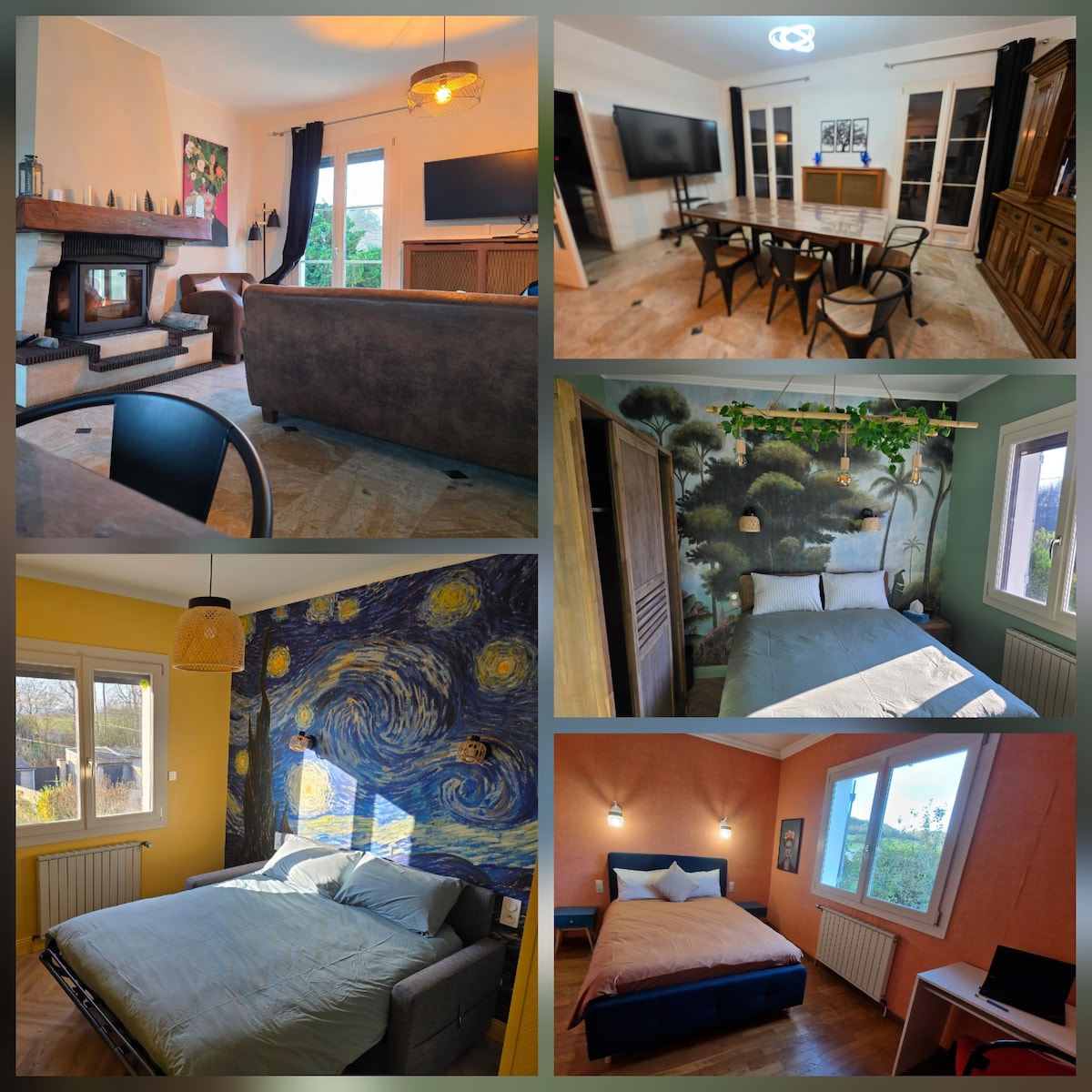 Enjoy as a couple or family of our large house located on the edge of the forest. Let yourself be seduced by these large rooms, its kitchen and fireplace for evenings by the fire in winter. Enjoy these two terraces with garden furniture in summer. From June to September we provide a jacuzzi, sun loungers, barbecue and hammock. We do not allow parties, the tranquility of the neighborhood must be preserved. We remind you that the house is 100 m² and the garden 1200 m².