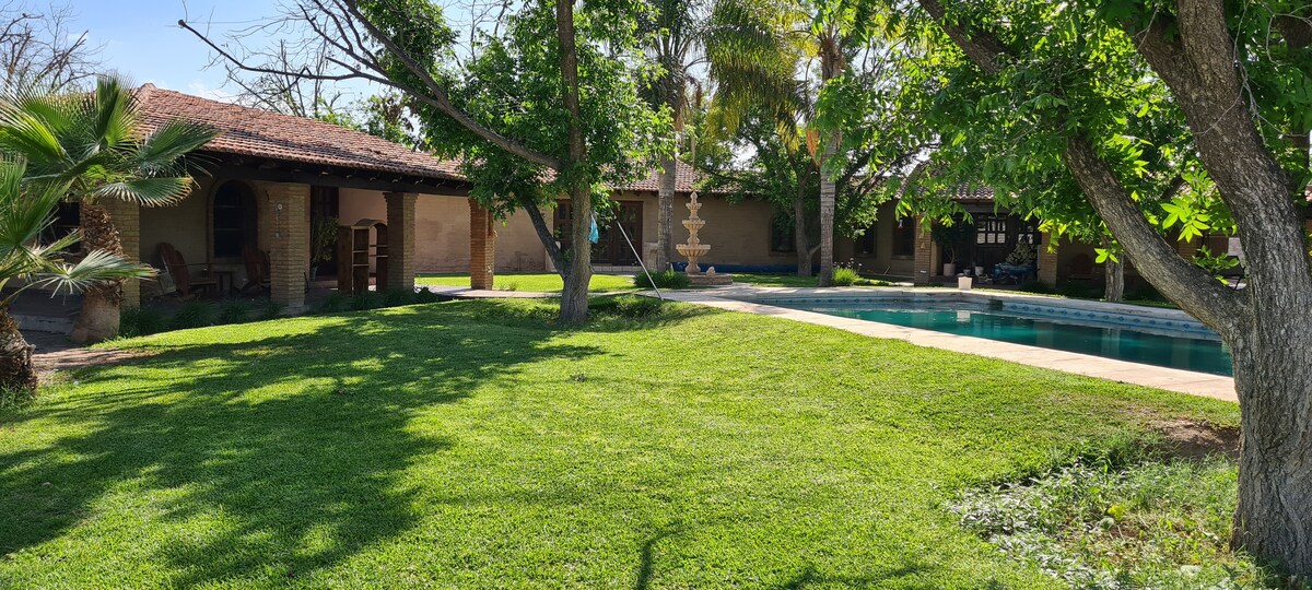 Relax in this quiet and unique farmhouse located north of Torreon, near the TSM stadium. Just 10 minutes from the city, you will feel at peace in this space with a swimming pool, barbecue, and a large garden where you can relax. Amenities include a swimming pool, a palapa, a barbecue, and shared gardens. 10 minutes from Galerias Laguna 5 minutes from Play Padel club 5 minutes from Padel ONE club right in front of EL CLUBSITO Paddle and Tennis Club. FAST WIFI!