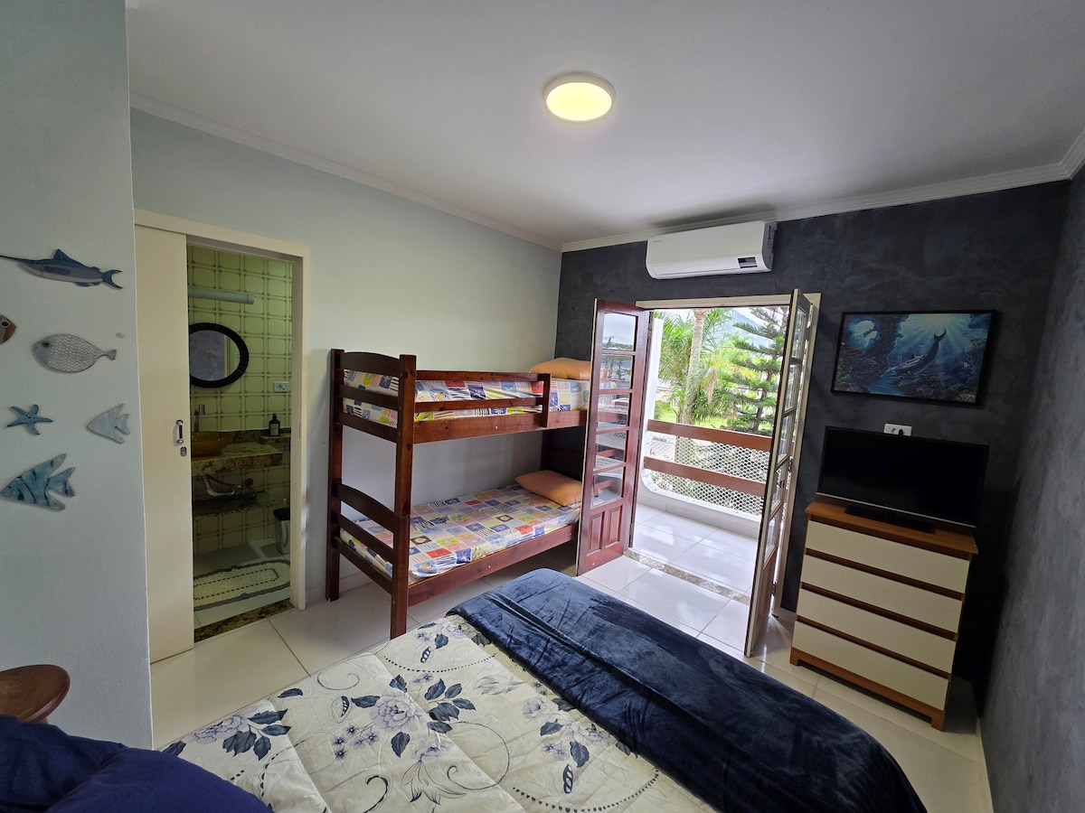 Great for families. Located on Massaguaçu beach. Newly decorated, 2 complete en-suites on the upper floor with air-conditioning, balcony in one of the rooms with sea view, toilet on the ground floor, complete kitchen, private barbecue, parking space for 1 private car, 100 meters from the beach, we have 4 chairs and umbrella for you to enjoy. Smart TV, Wi-Fi throughout the house. Nespresso machine, you need to bring capsules. Excellent location, markets, pharmacies, restaurants and health center nearby.