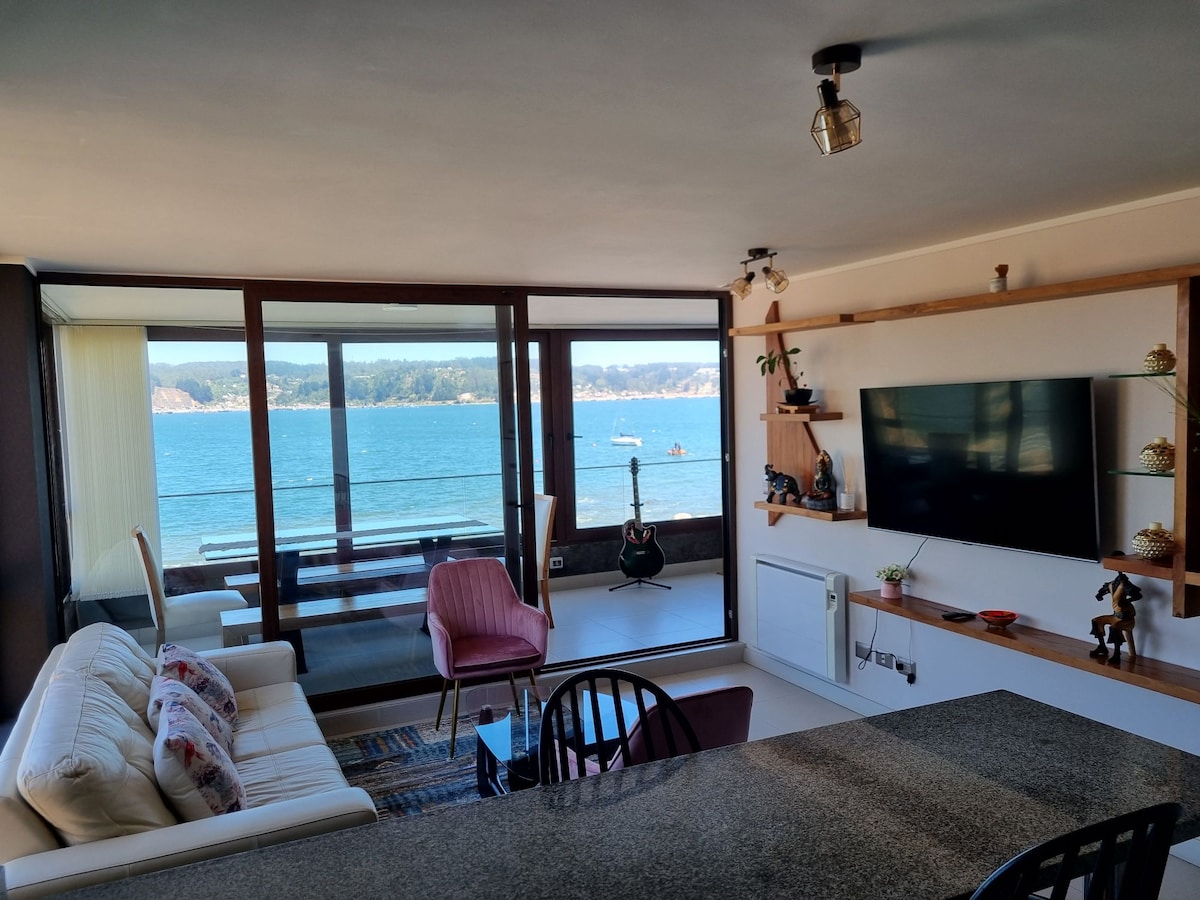 • Just 40 minutes from Concepción, with incredible ocean views, we are welcomed by 120 square meters of beachfront. Luxury apartment, with large living room - dining room, 3 bedrooms, 2 bathrooms, modern kitchen with separate loggia, large panoramic terrace with second dining room, sectional sofa and elegant SunFlex glass closure to enjoy all year round. • Equipped for 6 people, private condominium with 24/7 security, cable, Wi-Fi, swimming pools, beach, yacht club, gazebos, tennis courts, and paddle tennis.