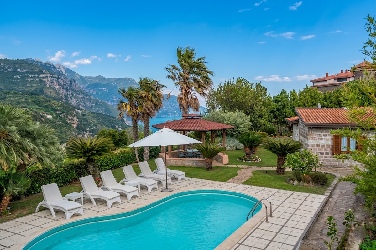 The Villa is in a dominant position on the sea, surrounded by gardens of lemon and orange trees. From the terrace, a breathtaking view that embraces the bay of Amalfi from Capo Vettica to Capo d'Orso, the historic center and the Cathedral of Amalfi and the opposite coastline from Salerno to Capo Licosa. Thanks to the isolation of part of the terrace it is possible to sunbathe in absolute privacy. At 350m, a Club pool/restaurant is accessible only at the conditions listed in Access for guest