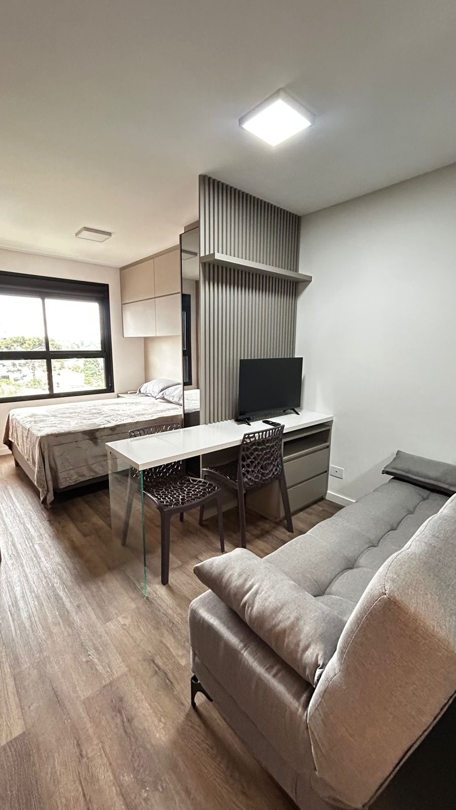 Relax in this quiet, stylish space. Brand new studio in Boa Vista. Fully furnished with planned furniture and total comfort for your business trips, concerts, tourism or long stays in the city of Curitiba. New building with 24-hour Remote Concierge (facial recognition to enter and exit), Gym, Professional meeting room, Coworking, Omo Laundry and Terrace with barbecue. Stay, rent, or live in one of Curitiba's most technological locations.
