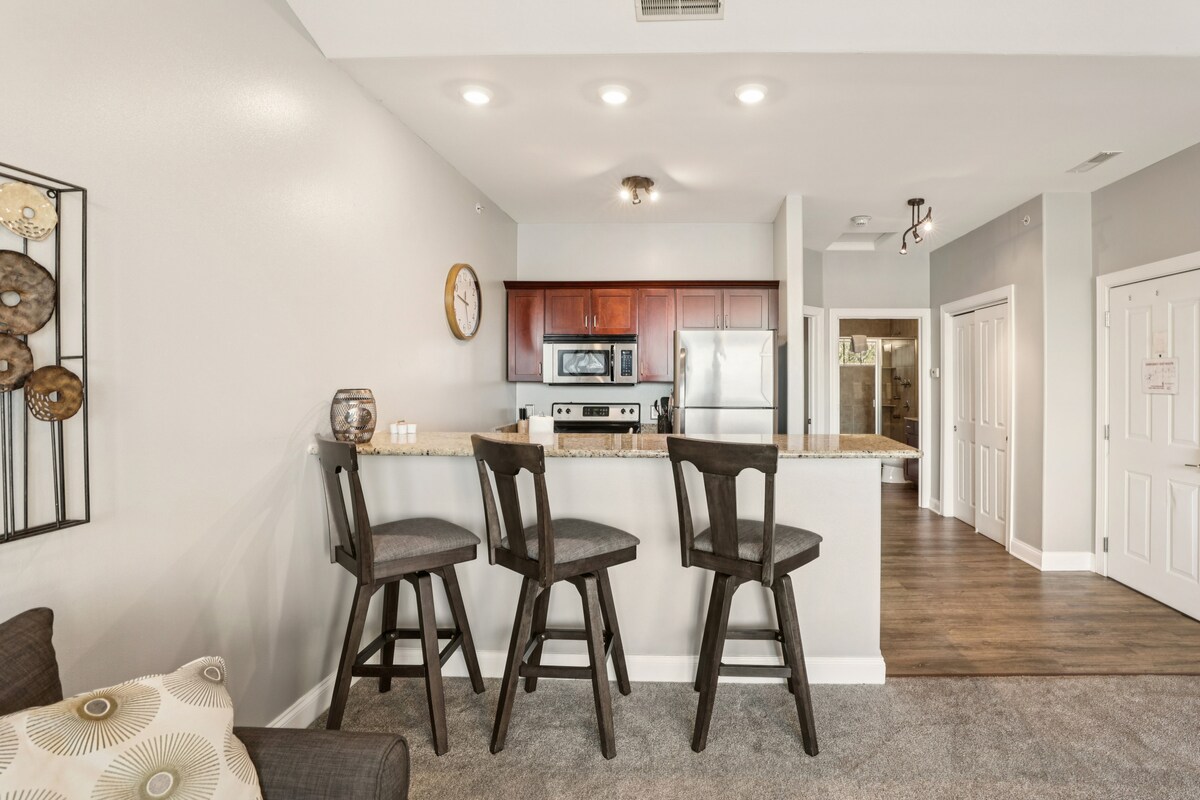 Hello, Welcome to our home! Relax in our cozy 1BR condo (688 sq ft), steps from downtown. Sleeps 4—queen bed with in-room Jacuzzi and a pull-out queen sofa bed. 📍 Ideal Location: Near downtown fun! 🌅 Peaceful Retreat: Serene river views! 🍽️ Convenience: Full kitchen & outdoor grill! 🏊 Clubhouse: Pools, hot tub & sauna! 🚤 Private boat slip included (please contact host) Book your getaway today!