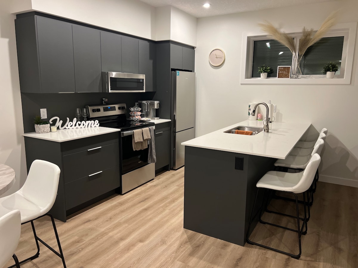 Rustic/modern decor with charm. Cozy master bedroom with king size bed and Smart TV. Two additional bedrooms with queen size beds. Perfect for families! ✧ 1400 sq ft ✧ 8 minutes to downtown core/ICE District ✧ Fully fenced yard with water feature & hot tub ✧ Parking for two + street parking ✧ Smart TV’s/Cable ✧ Keyless entry ✧ Tim Horton’s coffee grounds provided