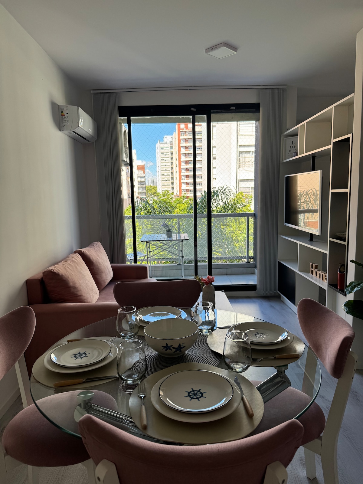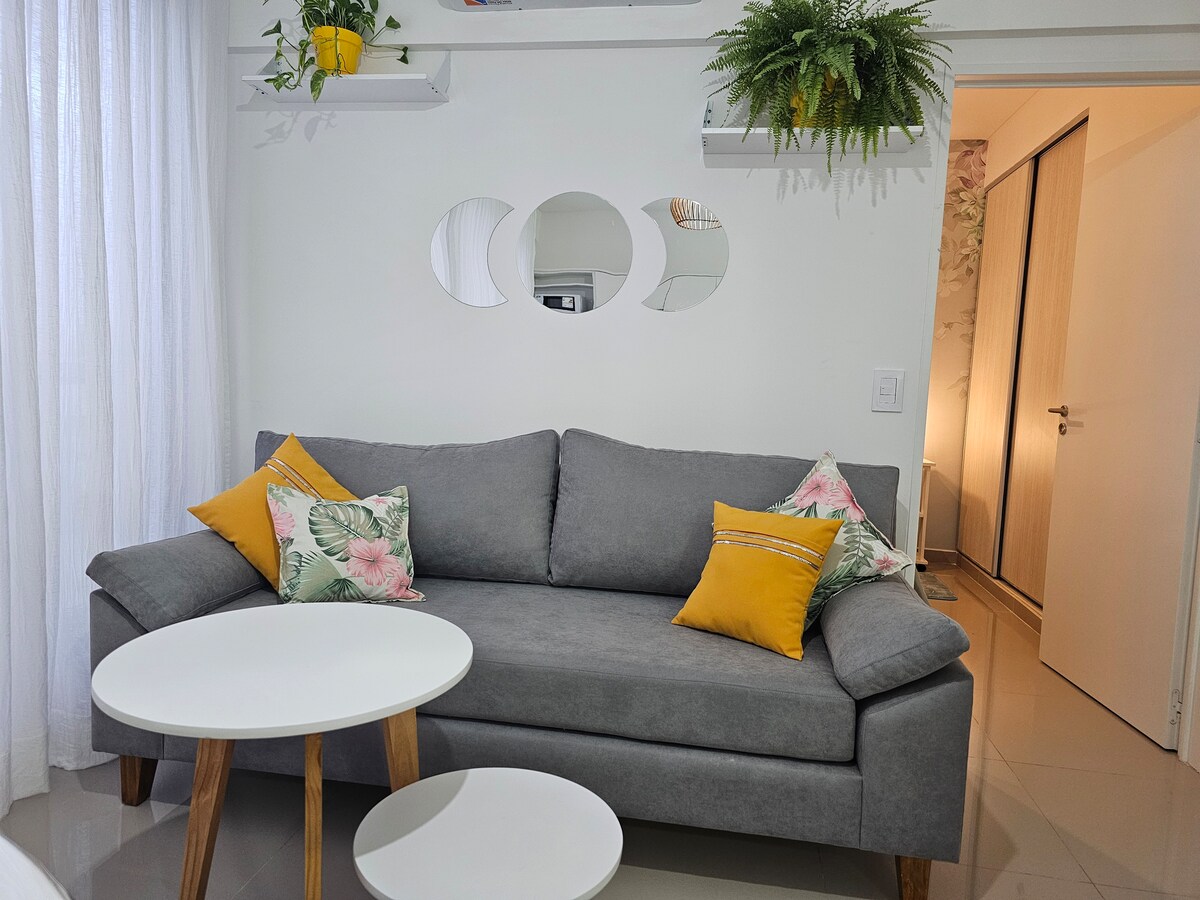 Coming back from a long walk to this apartment is a true relax. The living room offers a comfortable sofa to chill or watch TV. The table for 6 people can also be used as a study or work space. The bedroom has a comfortable double bed. The balcony, one more space, which proposes to sit and enjoy the view of the neighborhood, or simply rest, and for the guests, a toilette. The amenities offered by the building: gym, swimming pool, meeting room, games for children, grill and laundry.