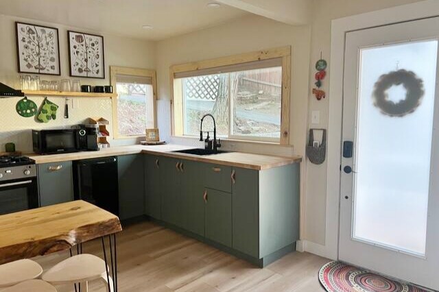 Hummingbird House is a tiny house decorated in a vintage style, with quality craftsmanship, making use of all recycled building materials. Tucked away on 20 acres with gardens all around, goats, hens, ducks, dogs and cats. The house is newly remodeled and has kitchen, bathroom, double bed, single bed/nook/couch, and dining area table and chairs, with modern heating and air conditioning. Coffee, herbal teas from the garden, sugar, honey, creamy goat milk and cheese are all supplied from the farm.