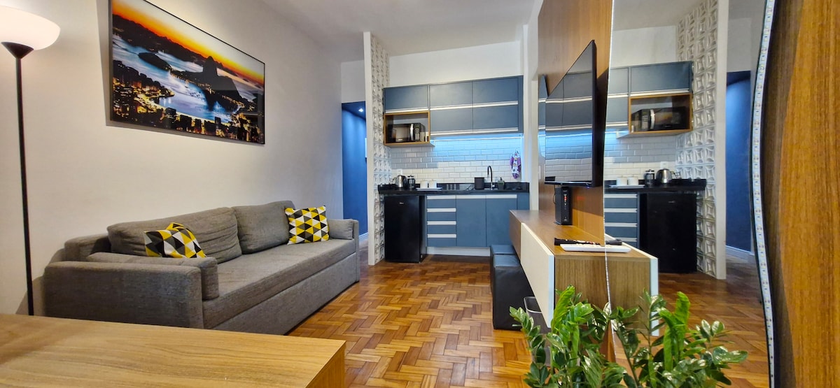 Just 1 block from the beach! Almost your own apartment: private studio within a 3-bedroom penthouse. Stylish small bedroom, private bathroom, living area, part of the veranda, fridge, microwave, and stove. Super fast 500mbps Wi-Fi + backup. Excellent location, close to the beach, subway, shops, bars, and restaurants. Perfect for those seeking comfort, privacy, and the vibrant energy of Rio de Janeiro.