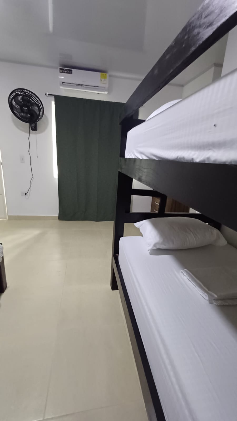 Private rooms for 1 or 4 people, includes a double bed, bunk bed, private bathroom, air conditioning, and TV. Just one block from the sea, in front of the Arrecifes Coveñas building. Yes, it's in Coveñas (first cove). Close to the sea and everything you need for a good rest, we have restaurant service ☀️