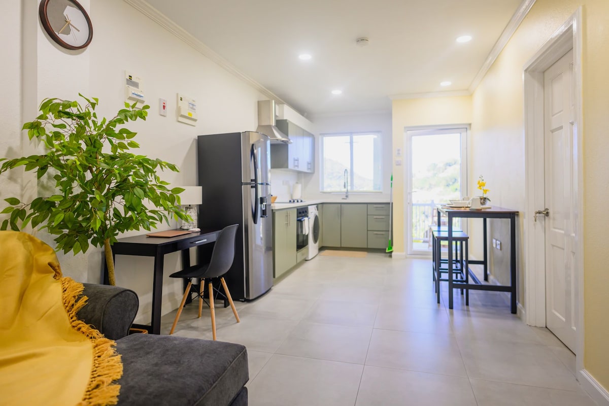This stylish place is a one bedroom apartment located in a quiet neighborhood, 5 to 10 minutes from beaches, shopping, restaurants and a two minute walk to the supermarket and to public transportation. Guest have access to a full bathroom, living room, a fully equipped kitchen with a washer dryer combo. Relax in the calm, brand new space!