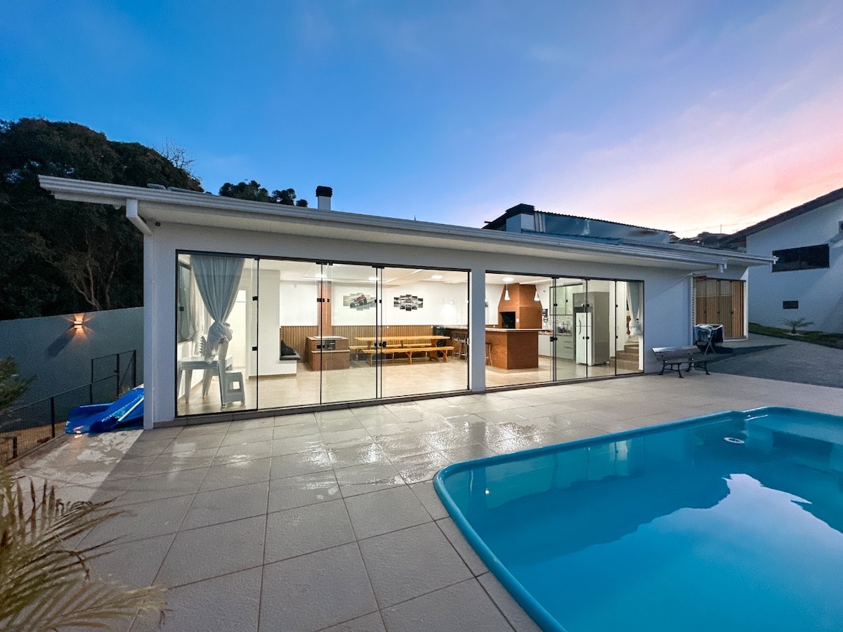 Casa com cozinha sob medida completa, com fogão, forno elétrico, geladeira, mesa e utensílios do dia a dia. Possui um quarto com cama de casal, roupeiro e ar-condicionado. Sala espaçosa com TV e poltronas. Banheiro grande. Garagem para dois carros e espaço externo com gramado e churrasqueira. Localizada em um bairro tranquilo, com belo pôr do sol, de fácil acesso a supermercado, farmácia, Havan e BR.