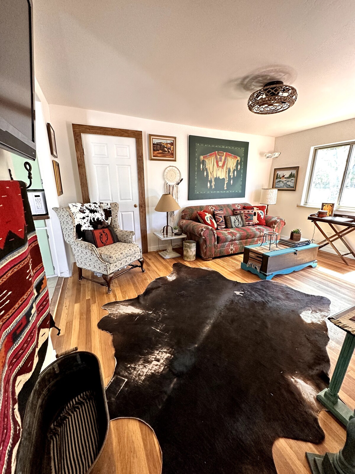 Welcome to our true New Mexican Adobe home, located in the North Valley of Albuquerque! Our home boasts viga ceilings, a beautiful sunroof, brick floors, and a true adobe fireplace. Off the beaten path and surrounded by rural land, horses, and blooming cottonwoods, the property is an ideal place to unwind and recharge. In warm or cold months, come enjoy our sauna in the sun room, our fire pit on our charming backyard patio, or our adobe fireplace in the living room. See you soon!
