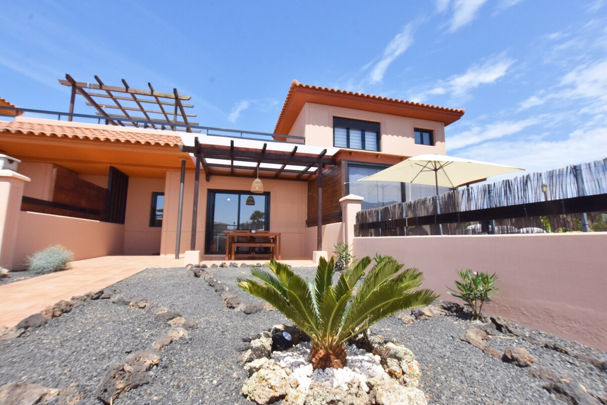 Fully refurbished bungalow boasting a large private roof terrace with sea views of Lobos and Lanzarote. Large quiet communal beachfront pool and paddling pool. (Just fully renovated). Situated within a small gated beachfront complex next to the popular surf spot 'Punta Elena'. We bought this property end september 2021 while it had 114 reviews with an average of 4,87 and hope to even improve this to make your stay a “memorable experience”