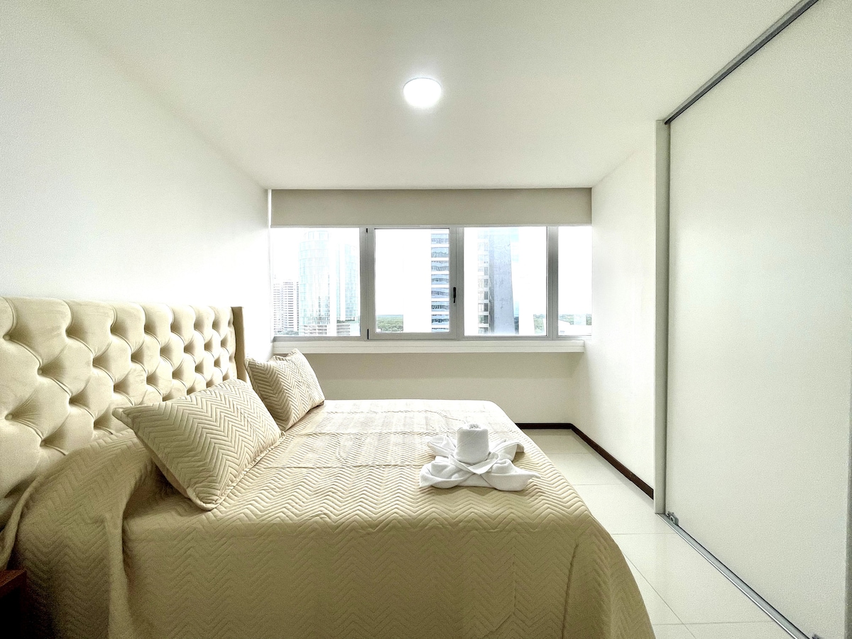 Disfruta tu estadía en el airbnb mas alto de Santa Cruz, y en el mejor edificio de la ciudad, en las instalaciones podrás disfrutar de Piscina, Sauna a Vapor, vistas espectaculares desde el piso 26 hacia el hermoso edificio Manzana 40, la naturaleza del cordón ecológico y el urubo. A unos pasos de supermercado, restaurantes, mall, centro empresarial, bancos, spa. En el mismo edificio Estan los restaurantes más altos y bellos de santa Cruz , Cielo skay bar y Jardin de Asia.