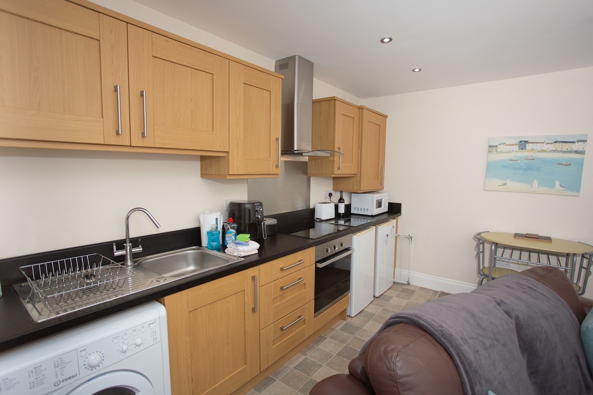 Contemporary, purpose built, one bedroom apartment. The apartment has been lovingly developed & decorated to offer a welcoming, bright & airy space, ideal for long or short term stays offering: - semi open plan lounge with TV, free wifi, dining table for 6 and comfy couches - fully fitted kitchen with dishwasher, washer dryer and fridge freezer - king size bedroom with leather sleigh bed & fitted wardrobes - bathroom with shower, shampoo, conditioner & shower gel, fluffy towels and bathrobes