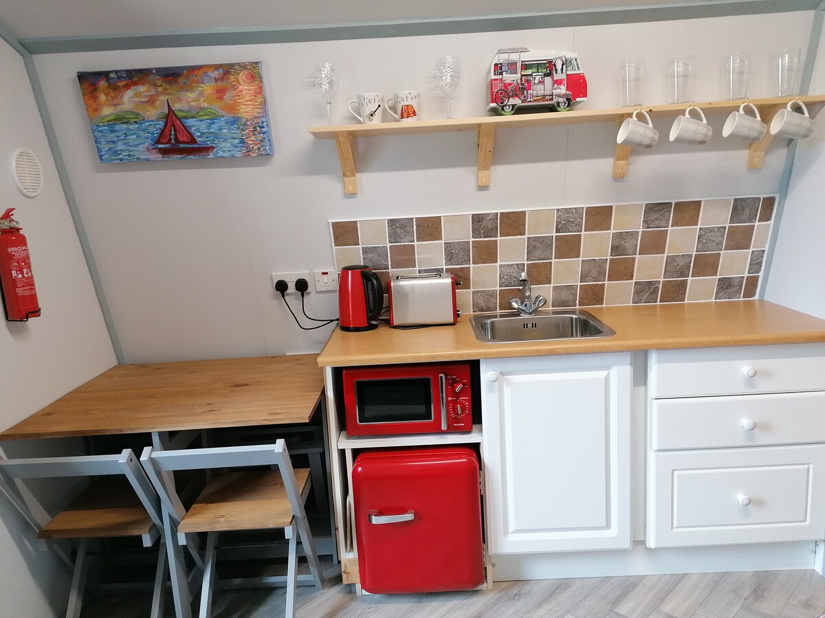 Six glamping cabins Situated in Dunmore East Mobile Park. The cabins are all en-suite. Each Cabin has a double bed & bunk beds (4 people). There is a patio area in front of the Cabin with patio table & chairs. Each Cabin has a mini fridge, kettle but has no cooking facilities. We supply linen towels & toiletries for the Cabin (no beach towels are supplied) There is a playground on site & Free parking. The Cabins are 1km from the beach & the village. Check in at the strand inn for the key