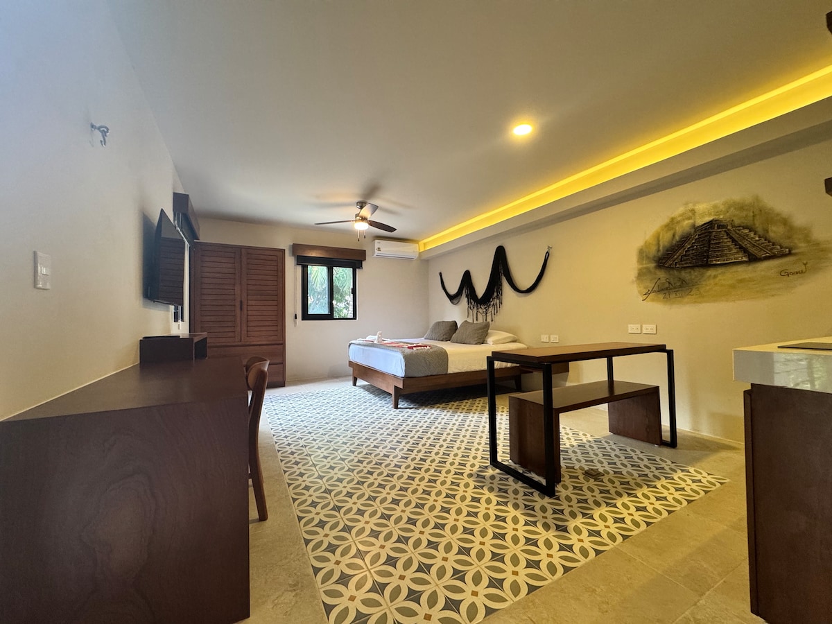 Relax in style at our beautiful, modern suite in Cozumel! This fully equipped suite is perfect for up to 3 adults, featuring a comfortable king-size bed and a sofa bed. Unwind on your private balcony and soak in the stunning ocean views. Enjoy a refreshing swim in our sparkling pool, grill up a feast, and feel secure with 24-hour security. We also offer free parking and WiFi for your convenience. Explore the Island! Scooter and ATV rentals are also available for an additional fee.