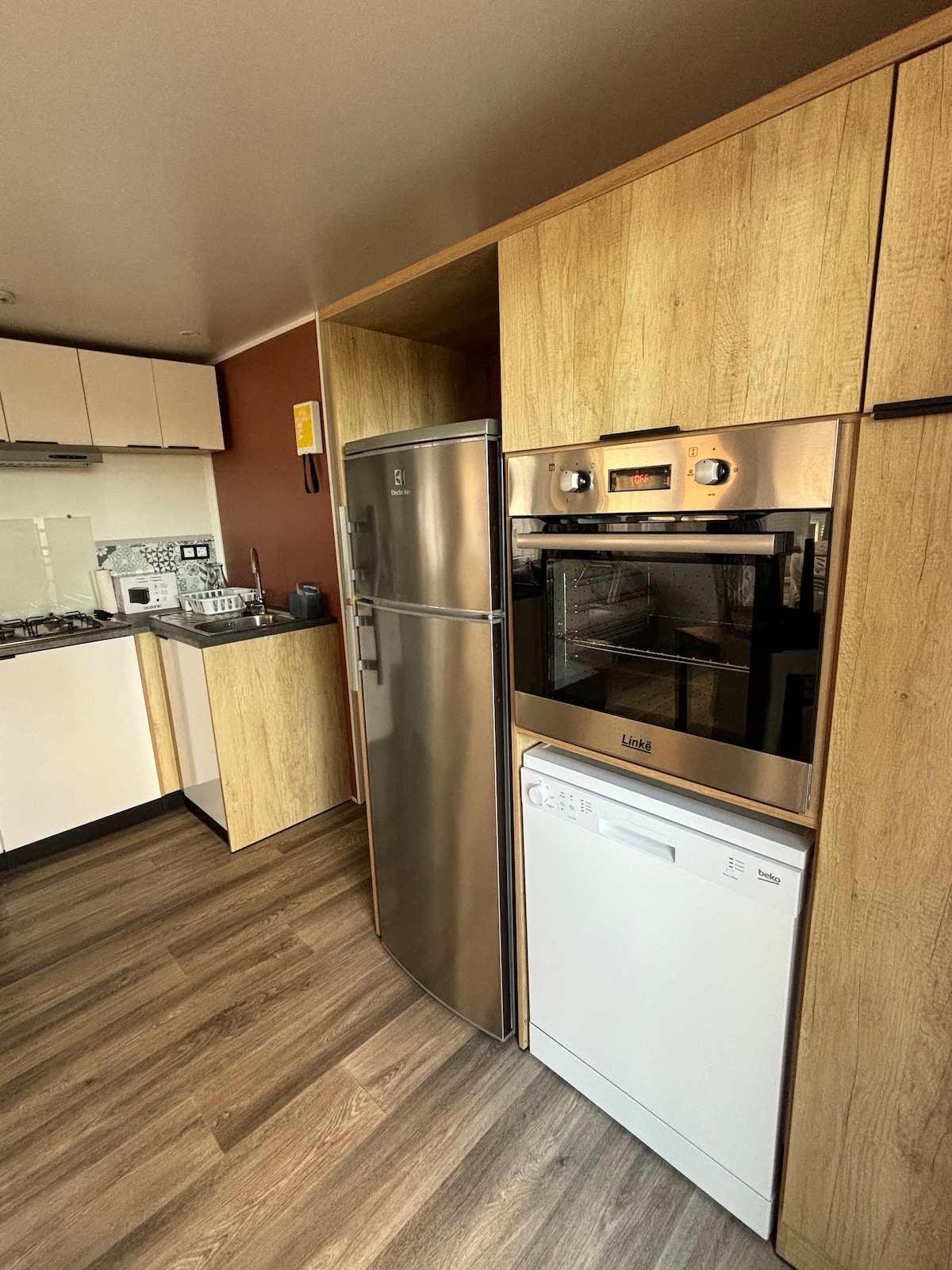 Our ocean view mobile home sleeps 4 people comfortably. 1 equipped KITCHEN, 12-place dishwasher, 5 kg washing machine, combined fridge, electric oven, microwave, kettle, toaster... 1 BEDROOM with 140 cm double bed, dressing room, 1 BEDROOM 2 80 cm single beds, closets, 1 comfortable BATHROOM with shower and sink, 1 separate toilet with hand wash, 1 LIVING ROOM dining area, living room, TV, heating available, 1 furnished TERRACE, outdoor furniture/barbecue.
