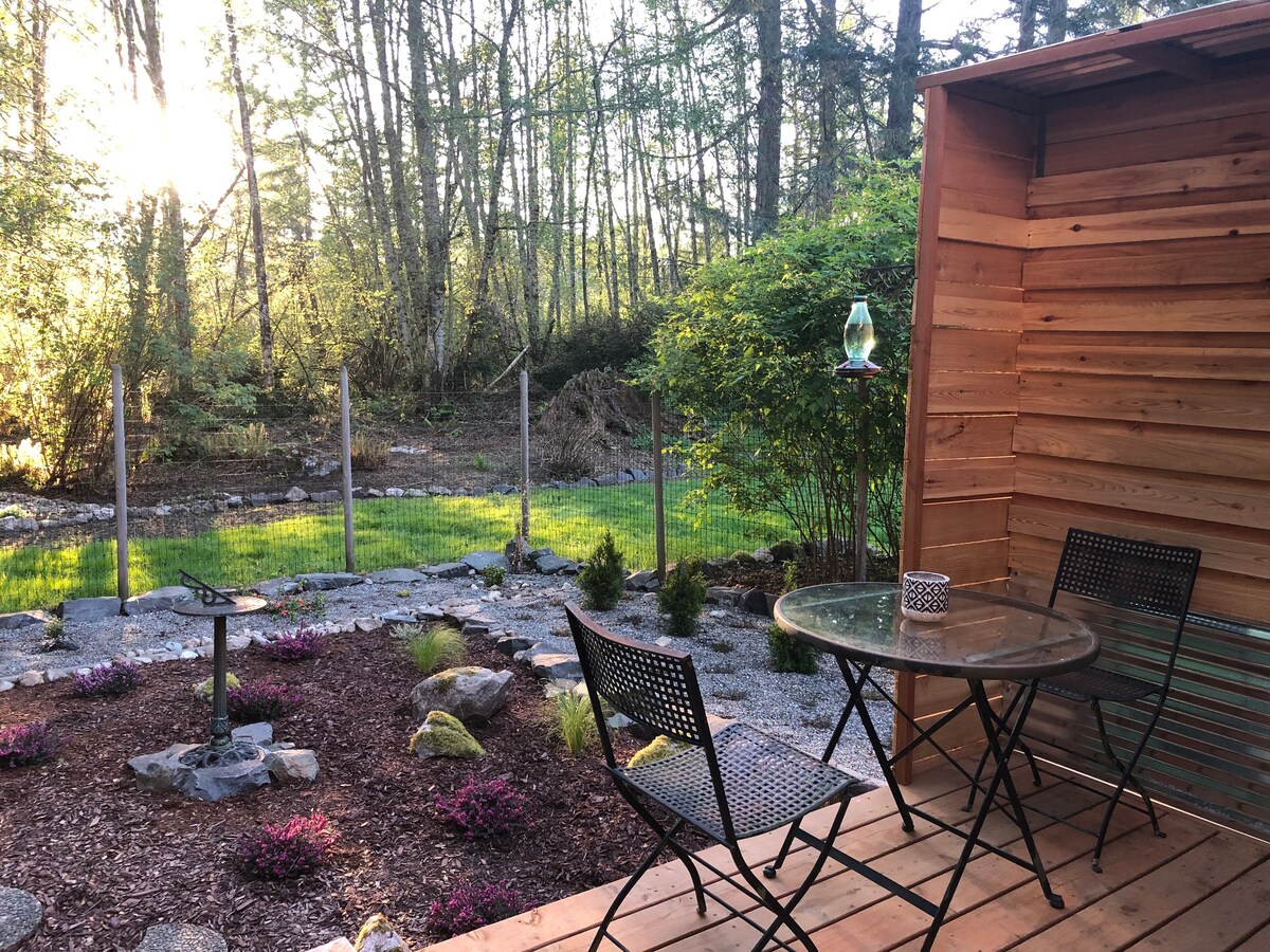 Welcome to your private forest oasis! Chic & cozy garden studio invites you to relax & take it easy. Peaceful property borders forest w/tall cedar trees. Unwind on your private deck w/fire bowl, sunsets, stars & birdsongs. Well stocked kitchen. Loft w/comfy Queen bed, private bath, French doors to deck, lovely garden & hammock. Experience the Pacific Northwest! Minutes drive to hiking & beaches. Seasonal berries & apples. A scenic stop between Olympic National Forest & Seattle.