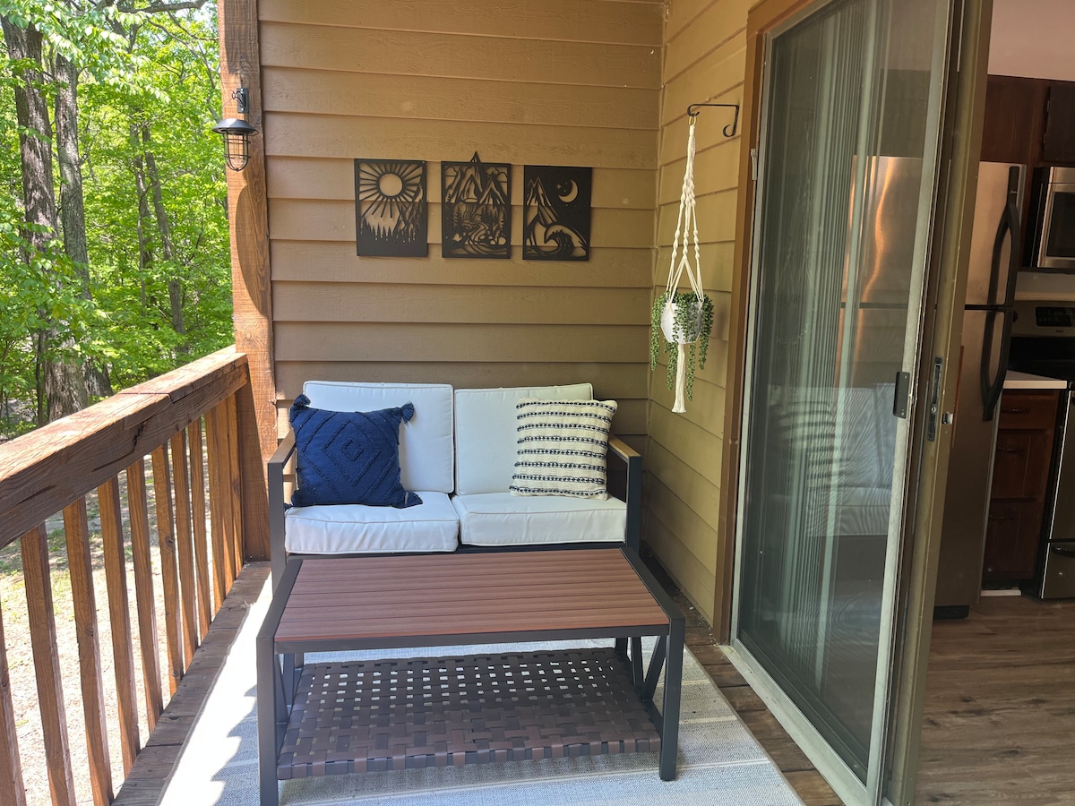 Cozy 1BR Wintergreen condo ⛷️❄️ 5-minute walk to the ski slopes, resort village, and mountain-too market, with snow tubing only minutes away. Enjoy a fully stocked kitchen, premium coffee and teas, cooking oils and spices. Relax by the wood burning fire and enjoy a smart TV, fast WiFi and games. Comfortable queen bed in the bedroom plus new queen sleeper sofa in the living room. Private furnished patio with peaceful wooded views and close access to the village for après-ski.