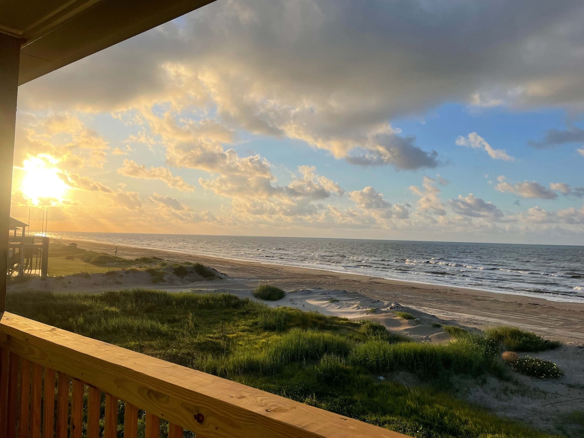 Welcome to this breathtaking beachfront beauty—your little slice of paradise right here in Crystal Beach!! This 4 bed, 2 bath beachfront oasis has everything you need for a perfect vacation. Spectacular views of both the sunset and sunrise, spacious accommodations, ground floor tiki bar, chef’s kitchen, propane grill and so much more—we look forward to hosting you!!