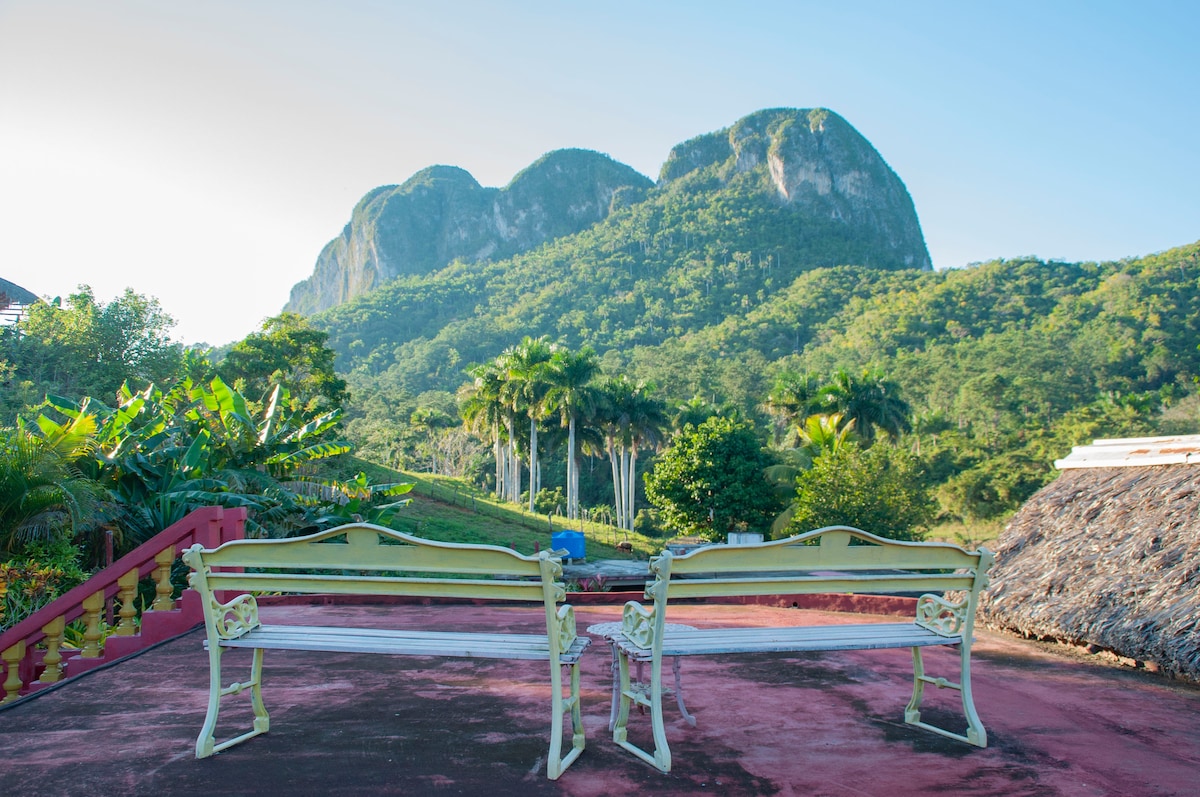 Cabaña rustica y sencilla a 8 minutos caminando desde el centro del pueblo con vista a las montañas y a menos de 3 km del Mural de la Prehistoria. Con 2 camas dobles con capacidad para 4 huespedes, con baño privado y servicio de agua fria y caliente las 24 horas, ademas ofertas de desayuno, cena, almuerzo, al estilo tradicional de Cuba. Ofrecemos tours a caballo, y caminatas. Tengo piedras del meteorito que cayó en el valle de viñales sobre mi casa, son de diferentes gramos. Servicio de WIFI.