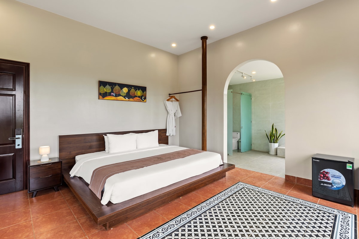This room is located in a 4-star resort, just 3km from Cuc Phuong National Park. A spacious 1.8m x 2m bed, perfect for guests seeking refined comfort. Wake up to peaceful garden views from your private terrace, where sunlight and fresh air create a relaxing start to the day. The suite features a private entrance, standard AC, soundproof walls, and a luxury suite bathroom with a walk-in shower and bathtub, plus a flat-screen TV. A tranquil and elegant stay designed for true relaxation.