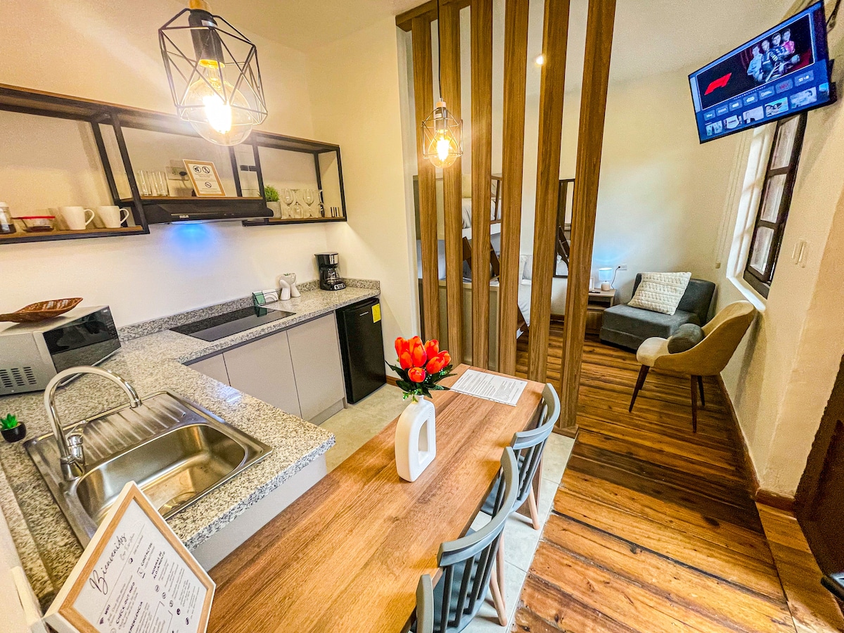 A solo pasos del tranvía de Cuenca, en la encantadora calle Tarqui, cerca de las iglesias más históricas de la ciudad y a solo dos cuadras del icónico Parque Calderón—hogar de los mejores bares y restaurantes—se encuentra Tarqui Suites. Ubicada en el primer piso de este edificio histórico, tu suite privada cuenta con todo lo necesario para una estancia cómoda, incluyendo baño privado y cocina completamente equipada. Disfruta de una estadía elegante y conveniente en el corazón de Cuenca.