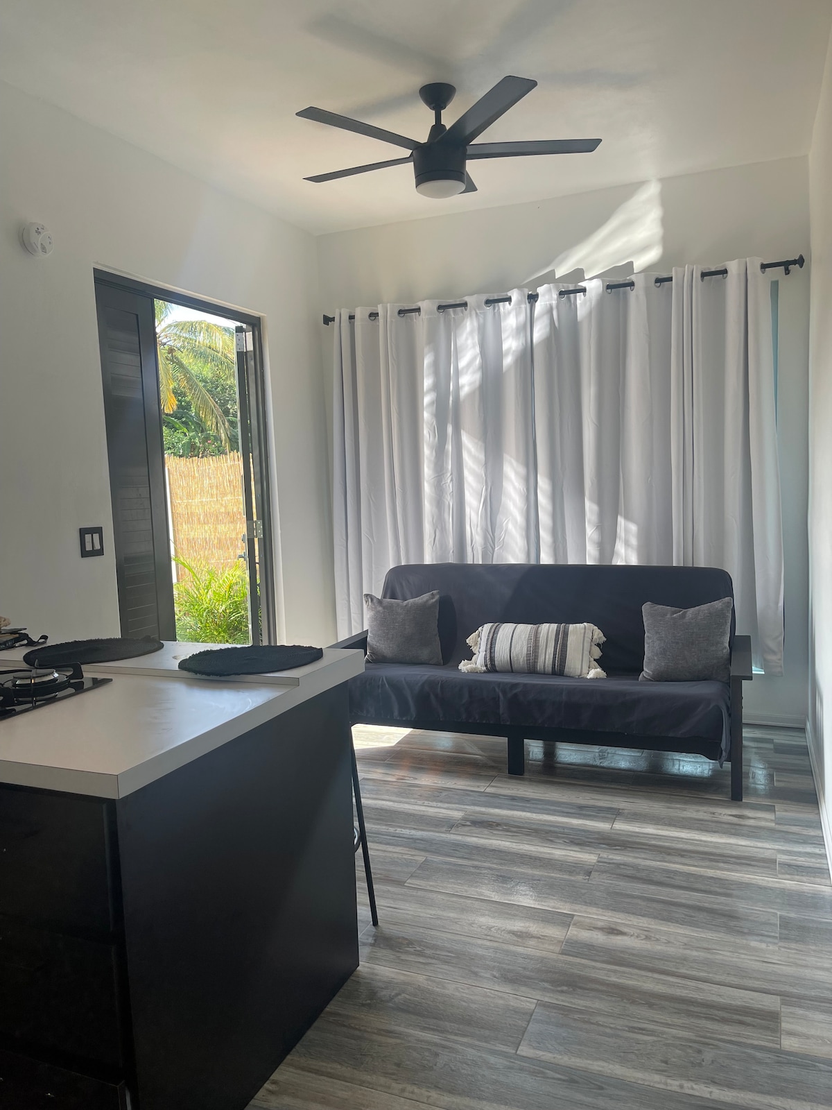 This homey vacation rental is a brand new construction and is a great place to enjoy the outdoors. The interiors feature a modern design, a full kitchen, full bathroom, outdoor shower, and sleeps 3 people. Listen to the sound of the coquis at night and enjoy the tropical breve e, relaxing in the beautiful plunge pool or grilling on the outdoor deck, surrounded by lush palms, fruit trees (breadfruit, lemons, bananas, plantains, cashews), and herbs (mint, sweet peppers, oregano).